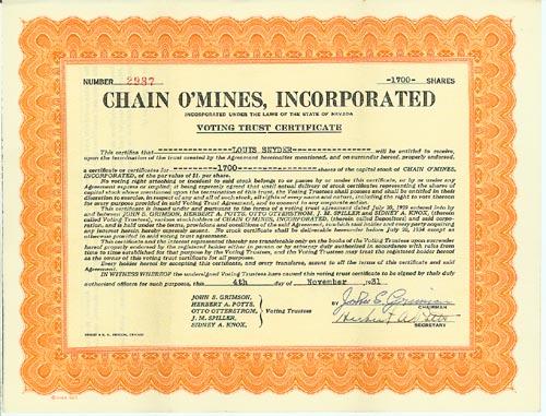 1929, Nevada. Stock certificate for 100 shares. Orange/Black.