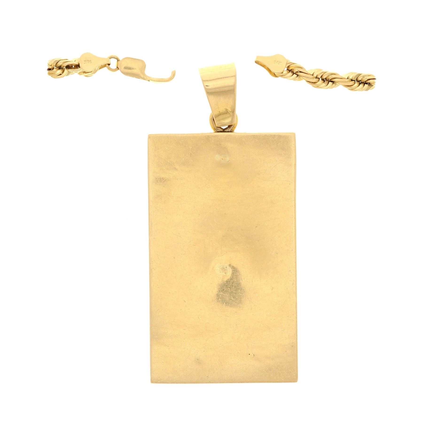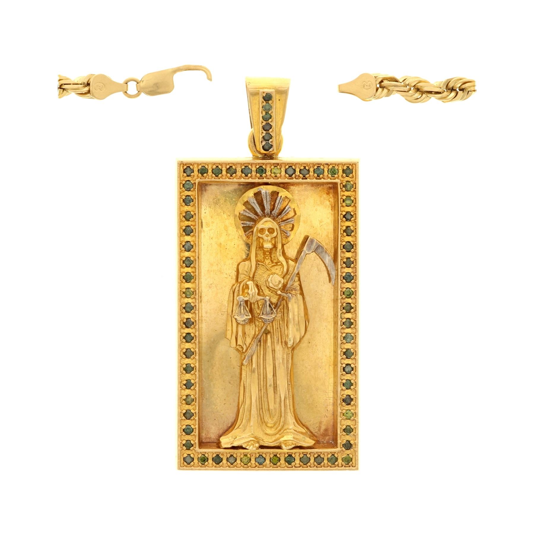 CHAIN & PENDANT: [1] 14k yellow gold rope chain, 26 inches long, broken clasp; 66.2 grams. [1] 10k yellow and white gold pendant; (68) round brilliant cut irradiated green diamonds, 2.0mm equals an estimated 2.00 total carat weight, Good/irradiated green/SI2; 67.1 grams.