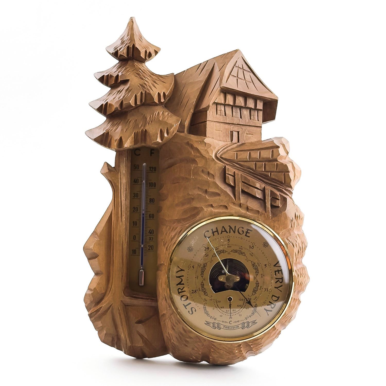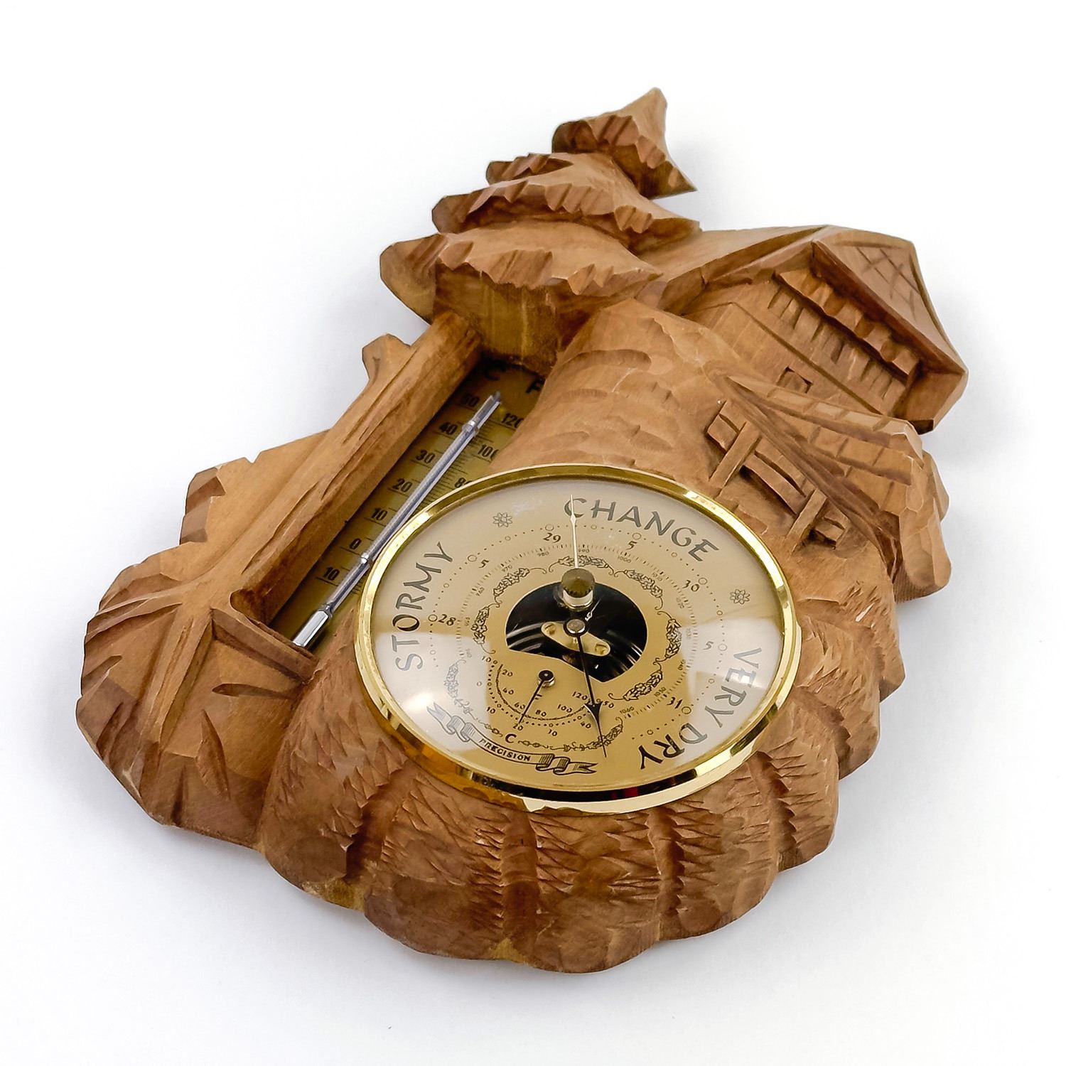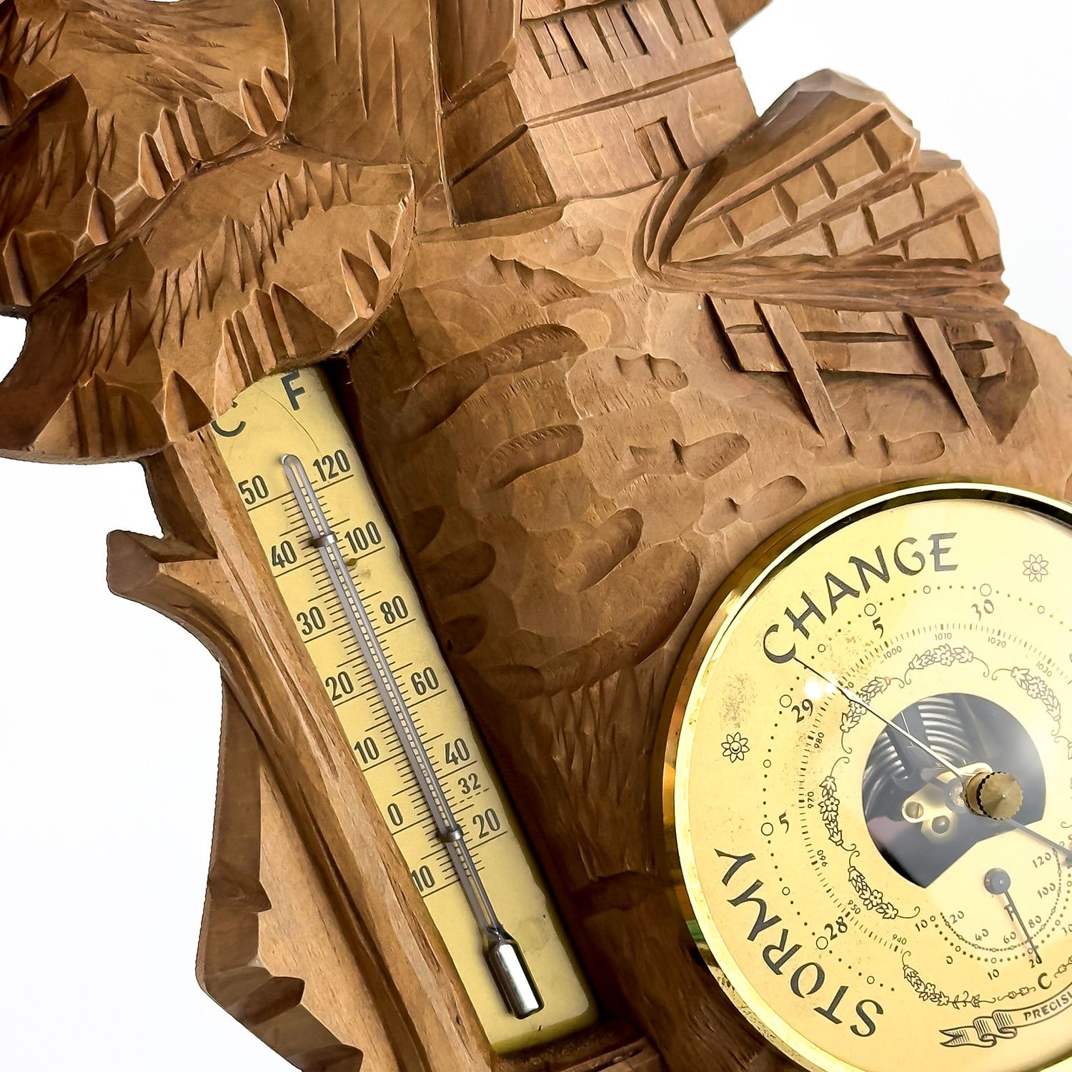 #8124 - VINTAGE HAND CARVED WOODEN TREE & CHALET PRECISION BAROMETER THERMOMETER. HOME, OFFICE OR BAR - WEATHER WALL DECOR SCULPTURE - CABIN, BUILDING, CHALET, TREES, NATURE. MEASURES: 10.5” (26.5 CM) TALL BY 7” (18 CM) WIDE AND ROUGHLY 2.25” (5.75 CM) DEEP/THICK