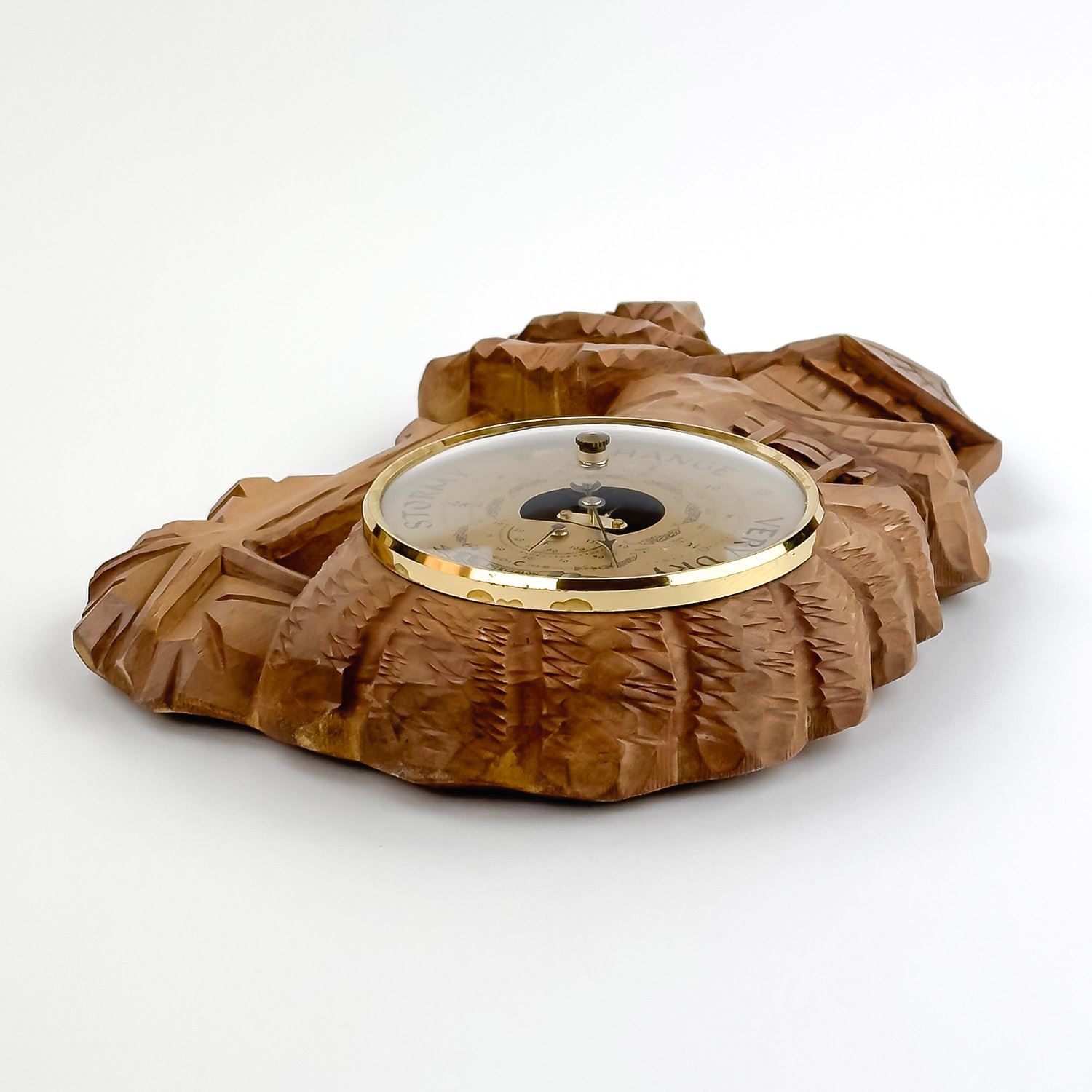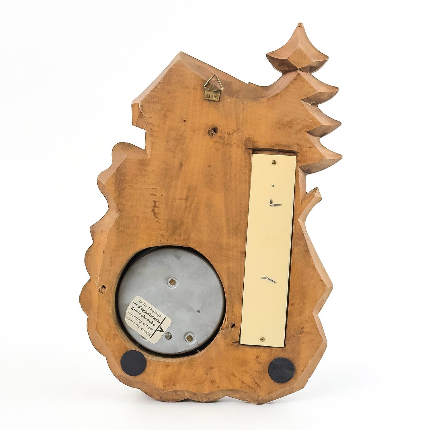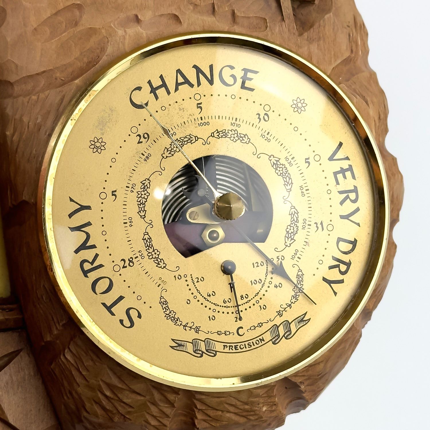 #8124 - VINTAGE HAND CARVED WOODEN TREE & CHALET PRECISION BAROMETER THERMOMETER. HOME, OFFICE OR BAR - WEATHER WALL DECOR SCULPTURE - CABIN, BUILDING, CHALET, TREES, NATURE. MEASURES: 10.5” (26.5 CM) TALL BY 7” (18 CM) WIDE AND ROUGHLY 2.25” (5.75 CM) DEEP/THICK