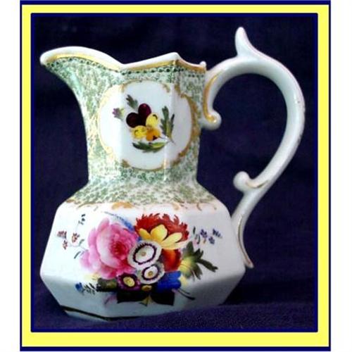 Jug / pitcher made by Chamberlain's Worcester, England, 18th century. <BR>Measures a little over 4 3/4inches high.<BR>Octogonal base flares out and then turns back at 45 degrees. Scalloped rim with nicely curved spout. Handle in the form of a scrolling branch. Gilt highlights and scrolls. Background of upper section composed of tiny green leaves. Preserves on either side handpainted with beautiful flowers. Superb decoration characteristic of Chamberlain's Worcester, amazingly fresh after more than 200 years. Petty wear to gilding on handle and inside rim. Painting and porcelain are in MINT condition. (we blacklight to check that there are no restorations). <BR>Marked underneath in red, handwriting: Chamberlain's Worcester. Mark used 1788-1810.
