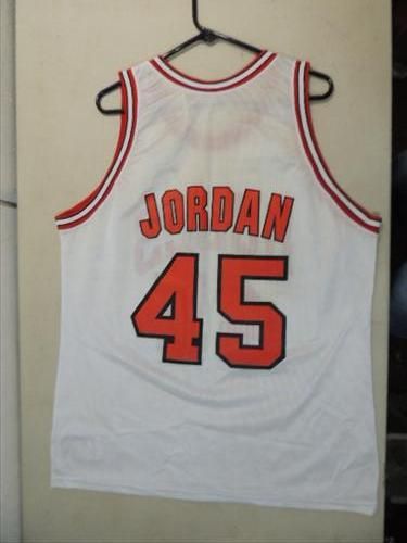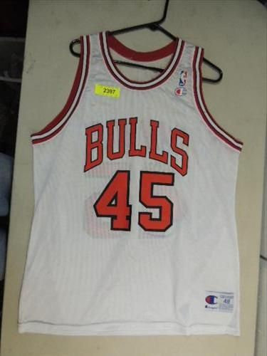 CHAMPION CHICAGO BULLS BASKETBALL WHITE JERSEY #45 JORDAN. SIZE 48. AS SHOWN. VIEW PICTURE FOR DETAIL.