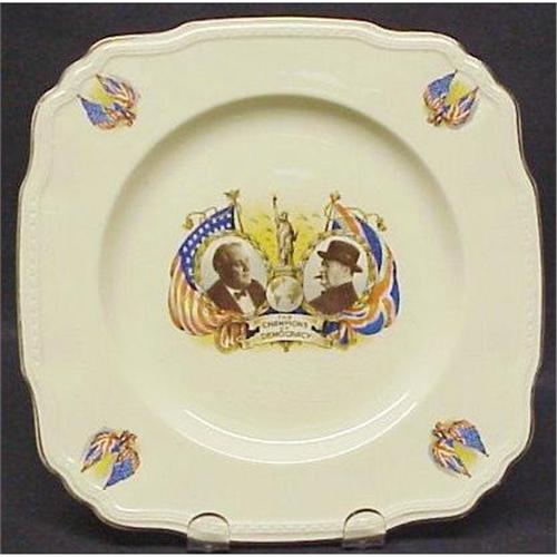 WONDERFUL PLATE,MADE BY ALFRED MEAKIN, ENTITLED "THE CHAMPIONS OF DEMOCRACY, DEPICTING PRESIDENT ROOSEVELT AND WINSTON CHURCHIL- MEASURES 8 1/2"IN DIAM. - US BUYER PAYS SHIPPING OF 9.50 PLUS INSURANCE.