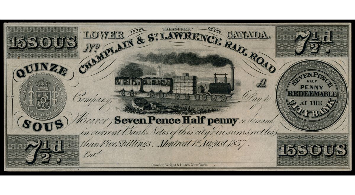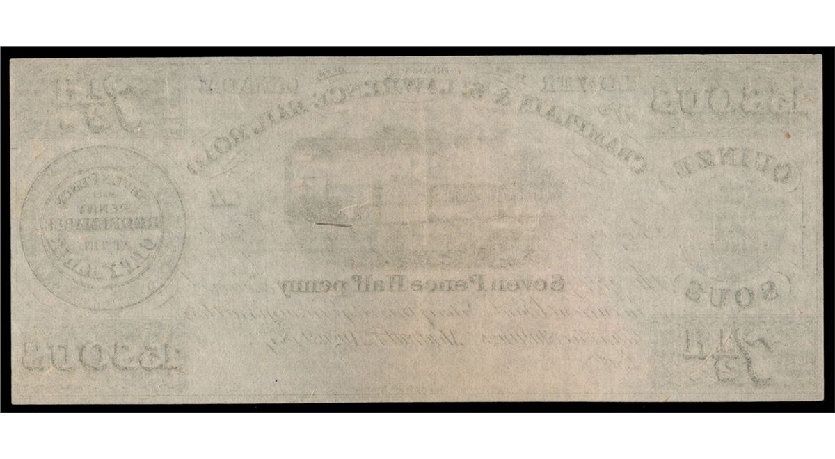 CHAMPLAIN & ST. LAWRENCE RAIL ROAD. 1 August, 1837. QC80-12-10R. An uncut full sheet of six (6) notes. Extra Fine. Ex. Heritage Auction, Sept. 2006. Lot #15780. CHAMPLAIN & ST. Law. R.R. 15 Sous. (7 1/2d). 1 August, 1837. QC80-12-02R. A Remainder. AU.