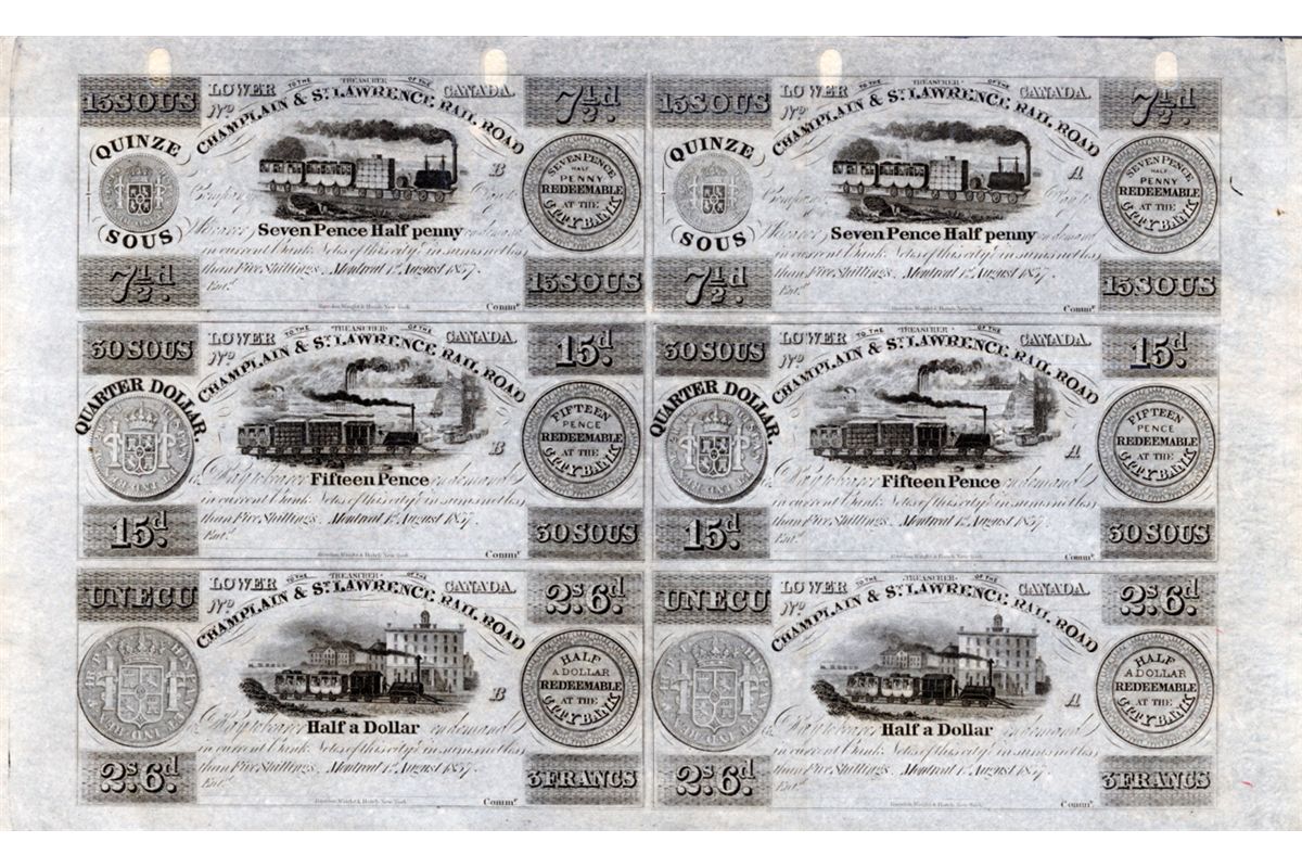 An uncut sheet of six (6) scrips. 15 sous, 30 sous & un ecu. (two of each denomination). 1 August, 1837. CH-QC80-12-10R. A Remainder sheet. Lot of two (2) sheets, both Extra Fine.