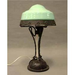 STRINDBERGSLAMPA, SMIDE, FOTEN MED HAMRAD DEKOR AV FJÄRILAR, GRÖN OPALINKUPA, JUGEND 1910/20-TAL, H50