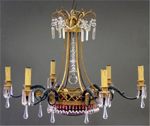 LJUSKRONA MED 6 LJUSARMAR, FÖRGYLLD OCH MÖRKPATINERAD STOMME AV BRONS, ORNAMENTERAD OCH GENOMBRUTEN, RÖD GLASSKÅL, EMPIRSTIL, RYSSLAND/BALTIKUM, H60, D80