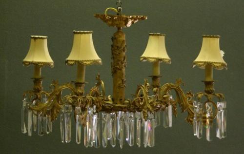 LJUSKRONA FÖR 4 LJUS, FÖRGYLLD BRONS, RIKT ORNAMENTERAD MED DEKOR AV BLADSLINGOR, STAVPRISMOR, NYROKOKO, 1800-TALETS ANDRA HÄLFT, H50, D85 (AVKORTAD, ELEKTRIFIERAD)