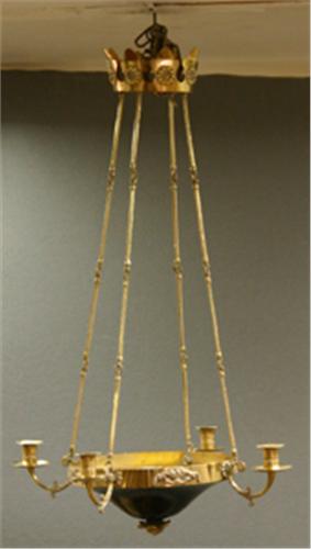 AMPEL FÖR 5 LJUS, MÄSSING MED SVÄRTAD SKÅL, KARL-JOHAN STIL, C. 1900, H75, D47