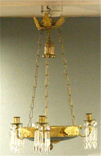 AMPEL FÖR 3 LJUS, MÄSSING MED MÖRKPATINERAD BOTTENSKÅL, LJUSARMAR MED ÖRN OCH KVINNOHUVUDEN, RIK UTANPÅLIGGANDE ORNAMENTIK, KEDJEUPPHÄNGNING, SENEMPIR, 1800-TAL, H55, D35