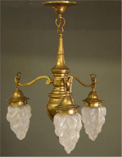 TAKARMATUR, MÄSSING, 3 GLASKUPOR IFORM AV ELDSLÅGOR, TIDIGT 1900-TAL, H67, D45