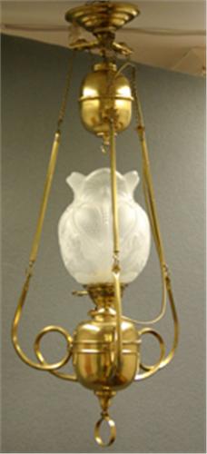 TAKFOTOGENLAMPA, MÄSSING, VRIDNA STÄNGER MED KEDJEUPPHÄNGNING TILL MOTVIKT, TULPANKUPA, H90, D35 (KUPAN MED SKADA, ELEKTRIFIERAD)