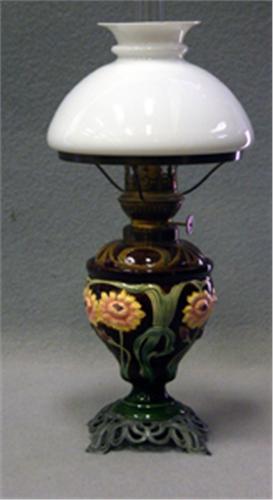 FOTOGENLAMPA, GENOMBRUTEN FOT AV GJUTGODS, DEKOR AV BLOMMOR PÅ BRUNTONAD GRUND, MAJOLIKA, VIT OPALINKUPA, 1800-TALETS SENARE DEL, H45 (OBETYDLIG NAGG PÅ KUPAN)