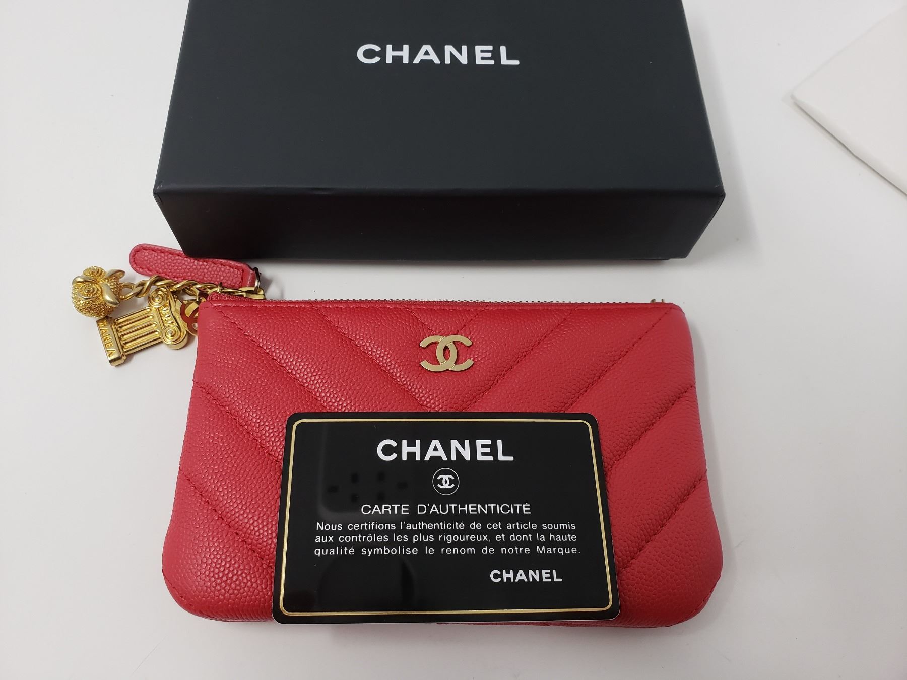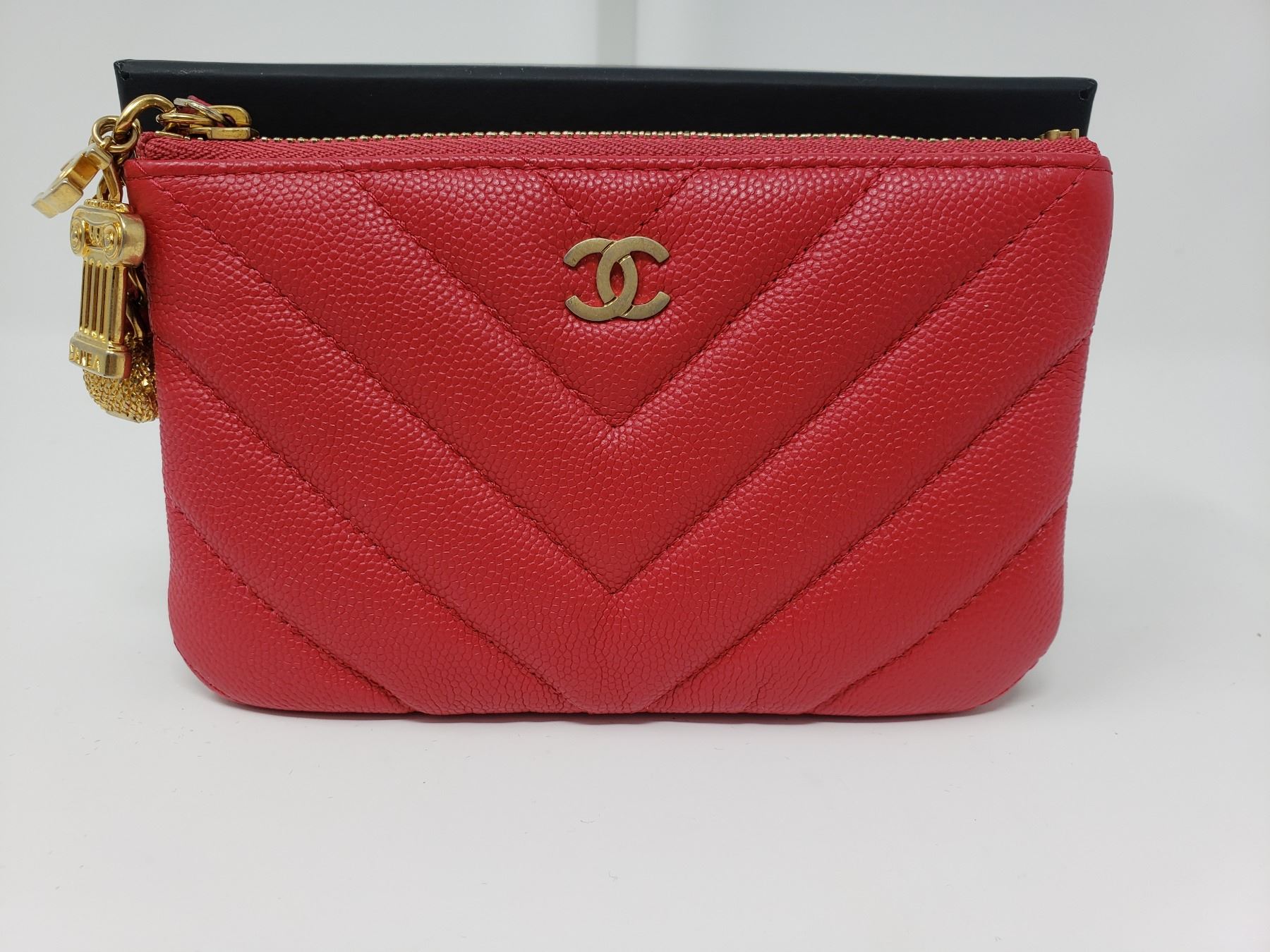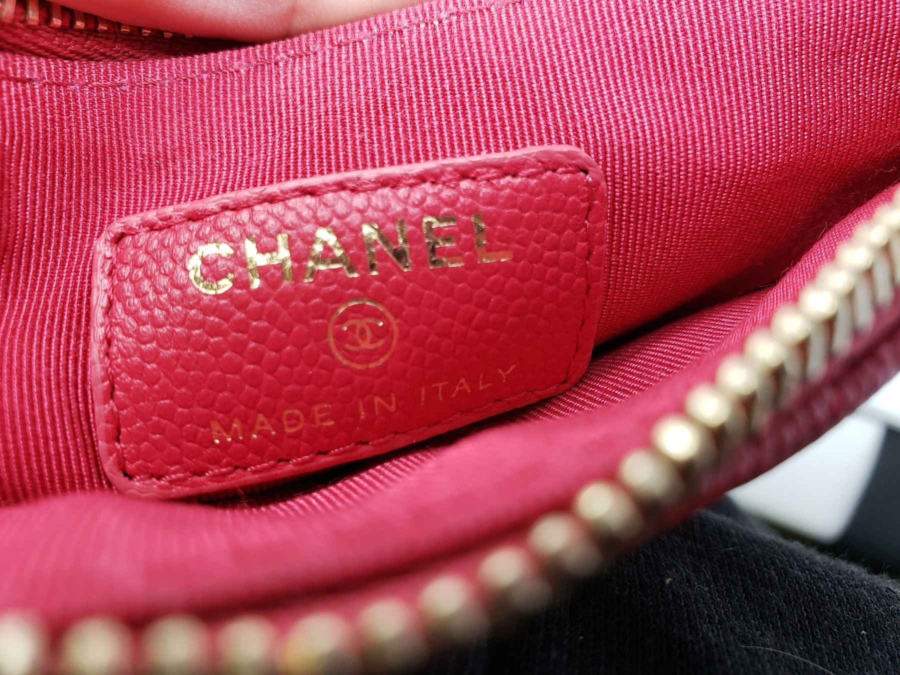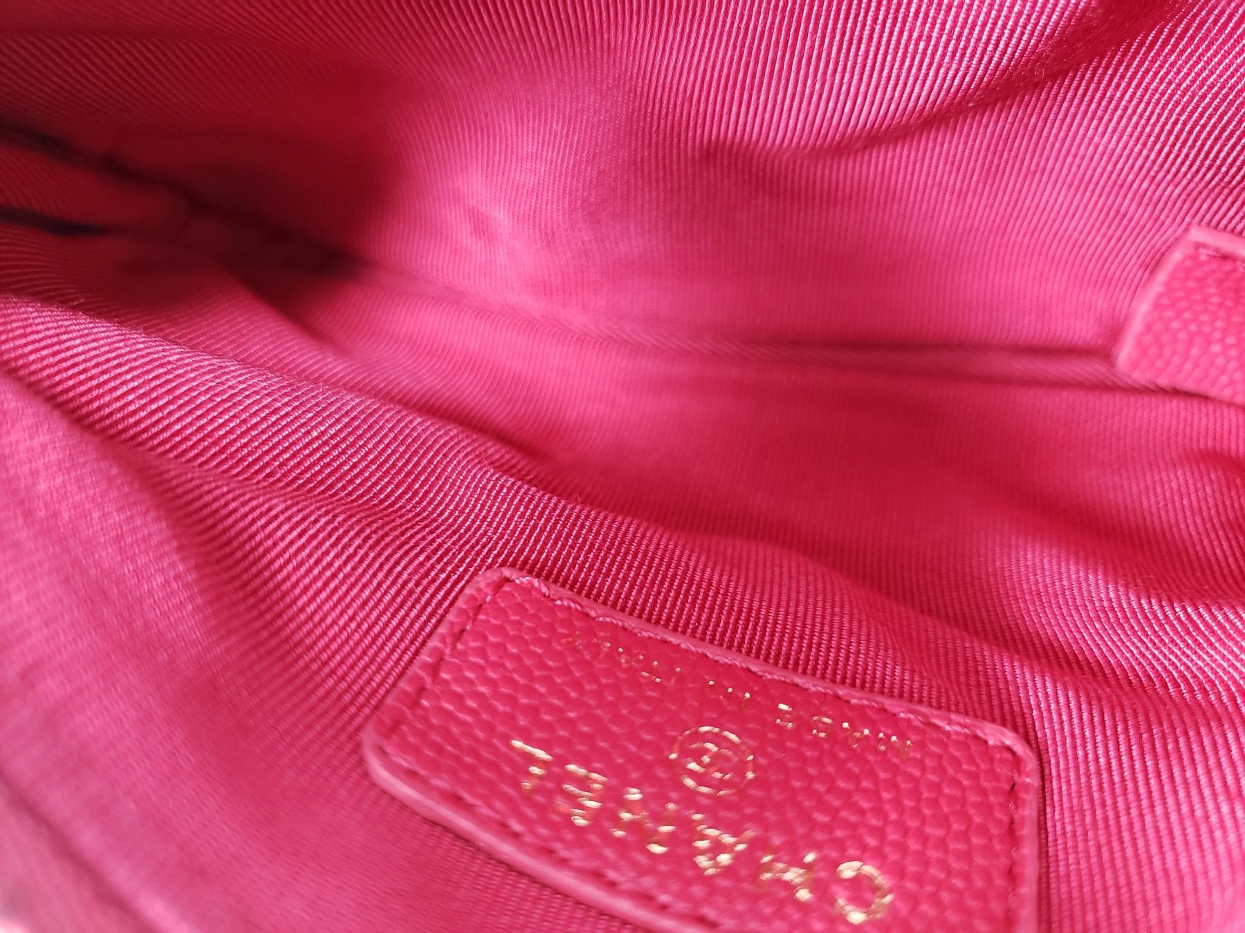 Crafted of caviar leather in fushia with a gold metal zipper closure