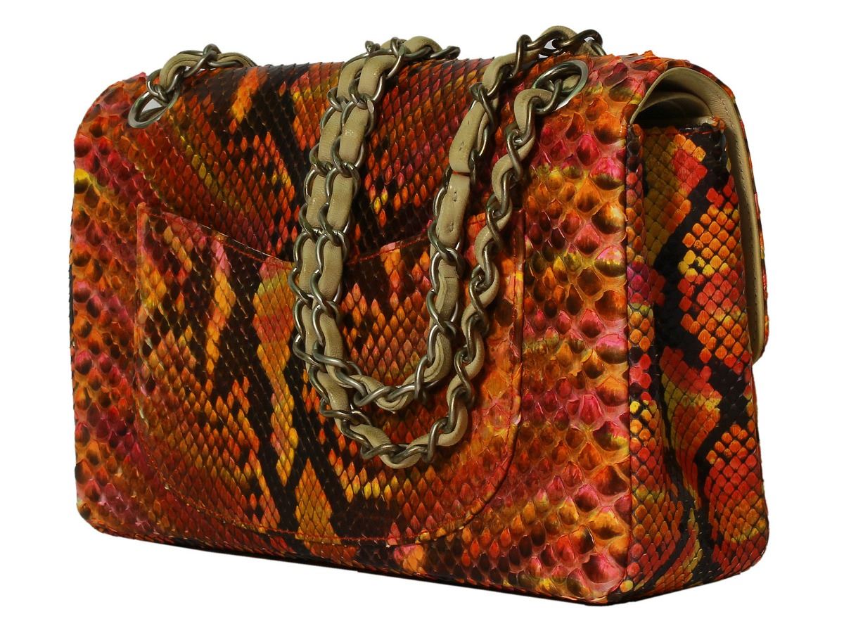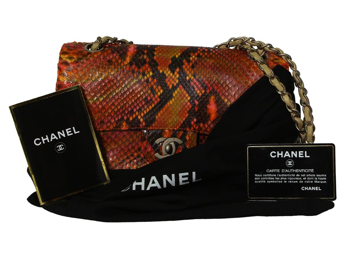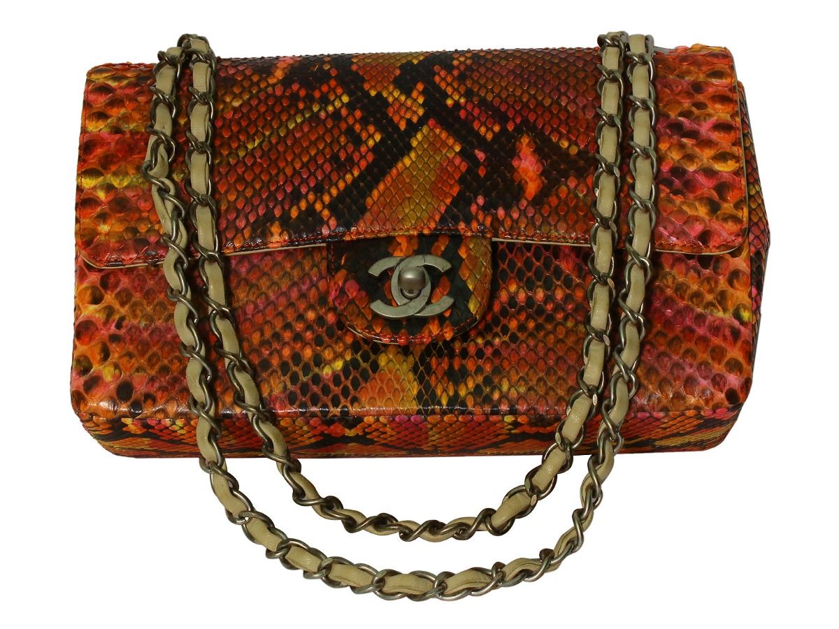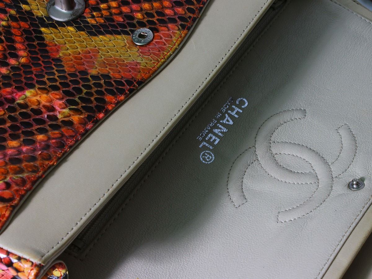 Gorgeous, sought-after multi-color genuine authentic designer Chanel Double Flat Python bag. Measurements for this bag are as follows: Top Width 9 inches, High 5 ¾ inches, Depth 2.5 inches. Expertly crafted with multiple colors, features hues of yellow, orange, pinks and reddish tones python skin exterior. A rustic goldish-toned double braided strap with beige leather completes the look. Interlocking CC rustic goldish toned hardware is set in the front on the clasped closure. Bag is in excellent condition, showing little signs of wear and tear. Beige toned interior matches the exterior straps. Stamped with Chanel, and another embossed interlocking CC for added detail on the inner fold over front snap. Comes with black dust bag with white lettering and CHANEL on the front, plus original cards for authenticity. WE SHIP WORLDWIDE!