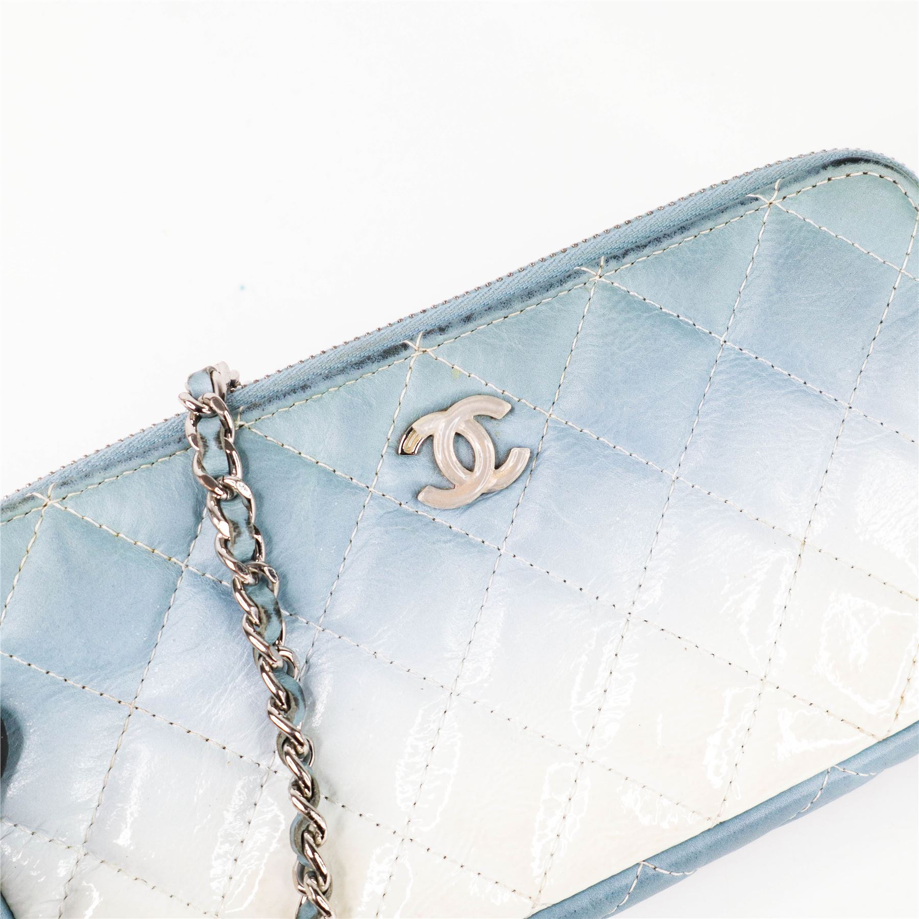 Notes on wear: Medium overall discoloration, rubbing and fading; medium corner wear; shoulder strap wrinkling, rubbing, and darkening (medium); hardware scratches (medium); interior rubbing, discoloration, CC logo chipped in top left hand corner