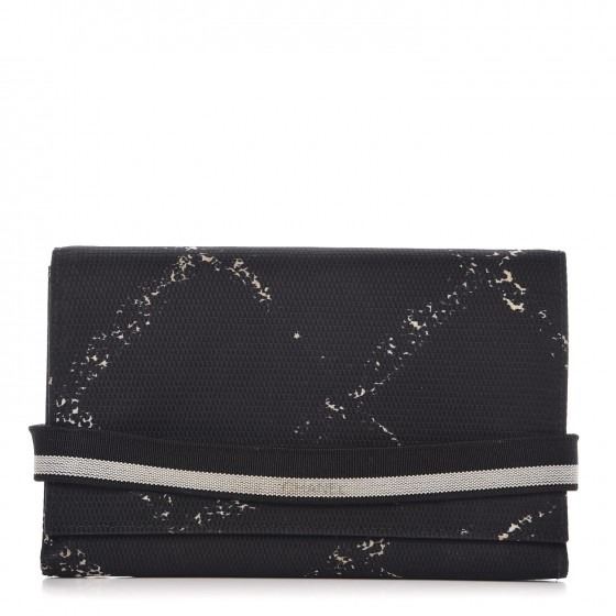 Description: CHANEL Nylon Print Flap Wallet Black, circa 1999, is crafted of black nylon fabric in a quilt like print. It features an elastic band in black and white that hold down the front flap. The flap opens to a black leather interior with a zipper pocket, card slots, and bill fold.