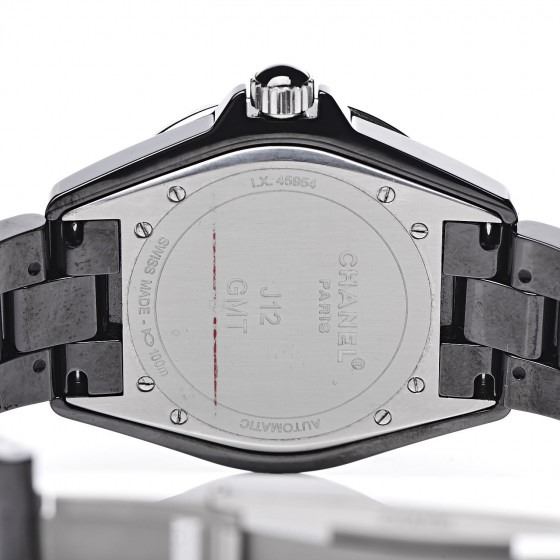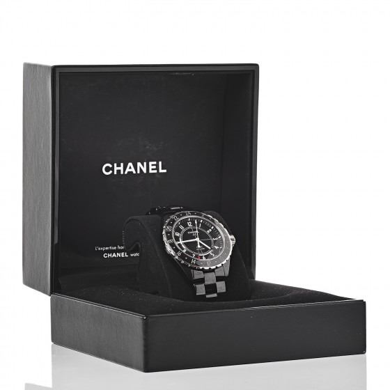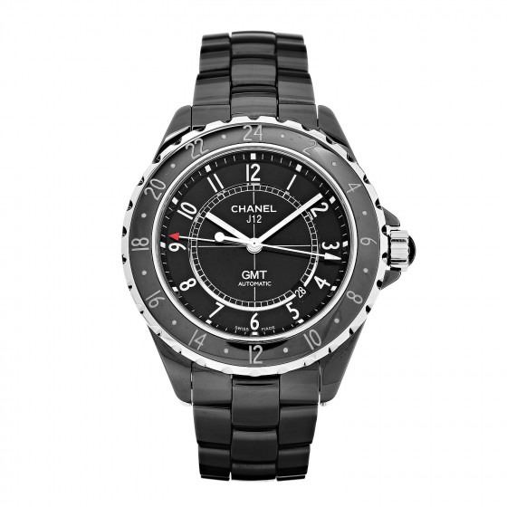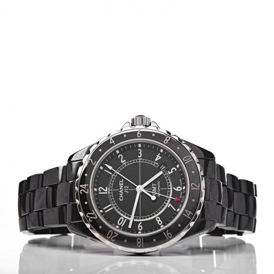 Description: CHANEL Stainless Steel Ceramic 42mm GMT J12 Automatic Watch Black. This watch is crafted of stainless steel and black ceramic. Features also include a 42mm case with a black dial, bold white hour makers and automatic movement.