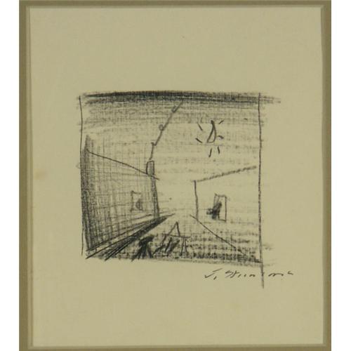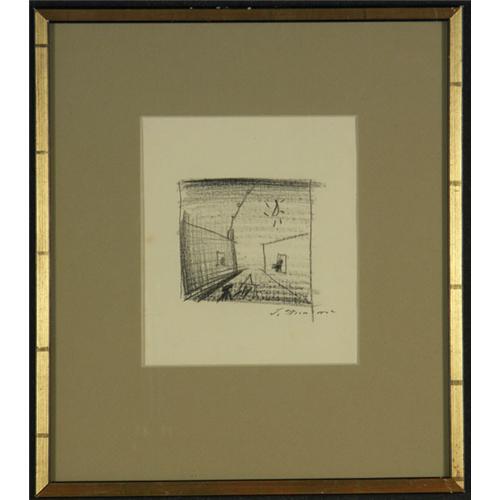 CHARCOAL ON PAPER 7 1/2'' x 6 3/4'', John Jay Steensma (1941-1994), WA. Between Two Dwellings with the Moon Overhead. Signed lower right. Matted and placed in a black frame with gold trim. Steensma was a Seattle artist whose large body of work is only now gaining widespread attention. His primitive style was greatly influenced by the Northwest School, especially that of Morris Graves. More info. in the white binder.