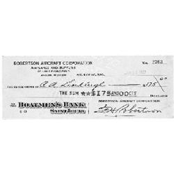<b>401. CHARLES A. LINDBERGH </b>(1902 - 1974)<b> </b>American aviator who, in his "Spirit of St. Louis", was the first to fly solo non-stop across the Atlantic Ocean. A rare and most desirable partly-printed D.S., a check from the Robertson Aircraft Corporation dated Jan. 31, 1927 made payable to "<i>C. A. Lindbergh</i>" for the amount of $175.00 drawn on the Boatmen's Bank of St. Louis. Hurriedly endorsed "<i>C.A. Lindbergh Jr.</i>" on verso. This check was likely the first of several stipend checks given to Lindbergh by Robertson Aircraft during the construction of the Spirit of St. Louis. Lindbergh worked for Robertson as an air-mail pilot in 1925 upon his graduation from the U.S. Air Service Flying School. Appointed as Chief Pilot, he taught other pilots, and in 1926 flew the Chicago to St. Louis air-mail route. He drew his last paycheck from Robertson as a regular pilot on Dec. 31, 1926 when he began work full-time in pursuit of the $25,000 Orteig Prize offered for the first trans-Atlantic solo flight. Robertson Aircraft would provide the first $1000 toward the purchase and modification of the Spirit of St. Louis. Cancellation punches do not affect signatures, but do affect Lindbergh's name on the payee line, otherwise the check bears very light soiling, two vertical creases, otherwise in very good to fine condition.<b> $3,000-5,000</b>