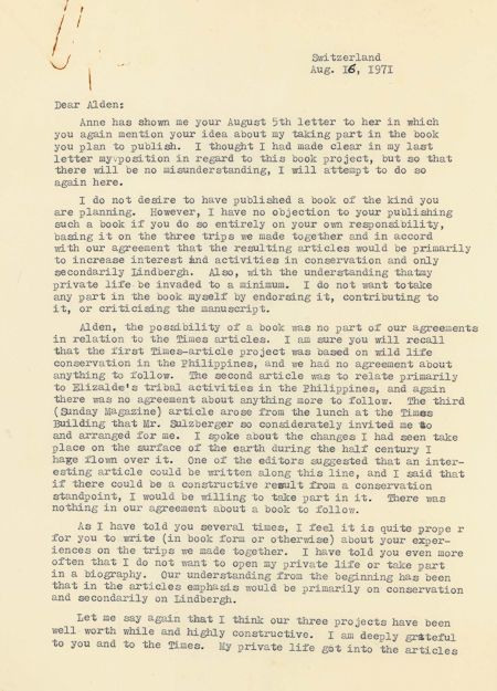 (1902 - 1974) American aviator who, in his "Spirit of St. Louis", was the first to fly solo non-stop across the Atlantic Ocean.Very fine content T.L.S. "Charles", 2pp. 4to., "Switzerland", Aug. 16, 1971 to Alden Whtiman at The New York Times voicing his opposition to cooperating with Whitman on a planned book. He writes in part: "...I thought I had made clear in my last letter my position in regard to this book project... I do not desire to have published a book of the kind you are planning. However, I have no objection to your publishing such a book if you do so entirely on your own responsibility, basing on the three trips we made together and in accord with our agreement that the resulting articles would be primarily to increase interest and activities in conservation and only secondarily Lindbergh. Also, with the understanding that my private life be invaded to a minimum. I do not want to take any part in the book myself by endorsing it, contributing to it, or criticizing the manuscript. Alden, the possibility of a book was no part of our agreements in relation to the Times articles. I am sure you will recall that the first Times-article project was based on wild life conservation in the Philippines, and we had no agreement about anything to follow... The third (Sunday Magazine) article arose from the lunch at the Times Building that Mr. Sulzberger so considerately invited me to and arranged... I spoke about the changes I had seen take place on the surface of the earth during the half century I have flown over it. One of the editors suggested that an interesting article could be written along this line, and I said that if there could be a constructive result from a conservation standpoint, I would be willing to take part in it. There was nothing in our agreement about a book to follow... I have told you even more often that I do no want to open my private life or take part in a biography. Our understanding from the beginning has been that in the articles emphasis would be primarily on conservation and secondarily on Lindbergh... I feel that my personal publicity has mounted much too high. I want to return to a quieter life, and I am setting trends in that direction...". Lindbergh was still smarting from the rekindling of interest in his questionable politics in the years leading up to America's entry in to World War II as illustrated in the publication of his wartime journals in 1970. Lindbergh may have also had other personal reasons for avoiding the limelight. Interestingly, it is believed that apart from the "secret" German family, Lindbergh may have fathered two children in Switzerland as well. Light folds, paperclip stain at top left, otherwise fine condition.