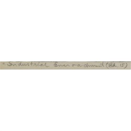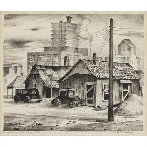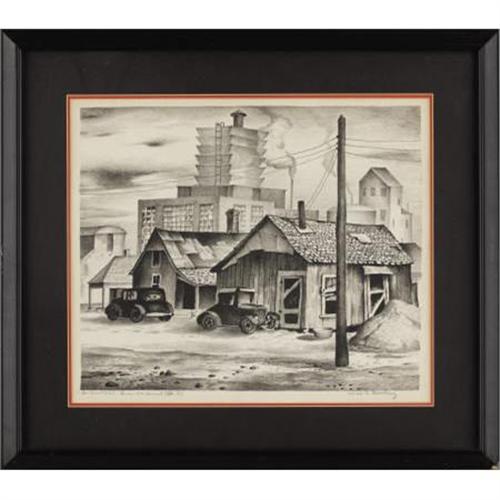 <B>CHARLES BOWLING (1891-1995)</B></I><BR><I>Industrial Encroachment</B></I>, 1939<BR>Lithograph on paper<BR>10 x 12 inches (25.4 x 30.5 cm)<BR>Signed lower right<BR>Titled lower left<BR><BR> This prize-winning lithograph depicts Dallas' Little Mexico neighborhood. The artist contrasts decrepit shacks in the foreground with modern industrial plants in the background. One gets the feeling that the shanties have little hope of surviving Dallas' coming industrialization.<BR><BR>The lithograph now seems a bit prophetic. Whittled down over many years to industrial and downtown development, the remaining vestiges of the Little Mexico neighborhood are now threatened by the Uptown and Victory Park areas. This lithograph is a superb technical achievement with its rich tonalities from black through light grays. The print has a small edition size (Ed. 15) and this example is in excellent condition.<BR><BR>Provenance:<BR>Charles Bowling<BR>Frances Layne (daughter)<BR>Pat Layne (grandson)<BR><BR>Exhibited:<BR>Dallas Museum of Art, Sanger Brothers Prize, Tenth Annual Dallas Allied Arts Exhibition<B>Condition Report:</B> Excellent condition. New frame in excellent condition.<BR><BR><b>Shipping:</b> Requires 3rd Party Shipping (<a target="_blank" href="http://www.heritageauctions.com/common/shipping.php">view shipping information</a>)