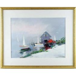 Lot # 1524 CHARLES C. GRUPPE (American, 1928-) GOING FOR THE MORNING SAIL. Acrylic on paper colorful scene shows Small sailboat with person is leaving dock area with building under a pink and blue sky with other sailboats and seagulls flying. Fine gilt molded wood frame with wide white matte. Signed lower left “C. Gruppe”. Charles is the grandson of Charles P. Gruppe SIGHT SIZE: 20-1/2” x 27-1/2”. CONDITION: Very good to excellent. 9-98458 (500-700)