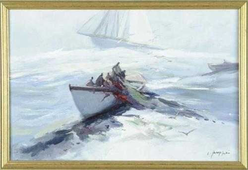 CHARLES C. GRUPPE (American, 1928-) PULLING IN THE NETS. Oil on canvas seascape scene shows boat with several men pulling in colorful net. A sailboat is seen in background with another boat. Signed bottom right "C. Gruppe". Housed in a gilt molded wood frame. SIZE: 24" x 36". CONDITION: Very good. 9-26436