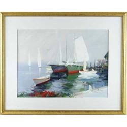 Lot # 1523 CHARLES C. GRUPPE (American, 1928-) SAILBOAT. Acrylic on paper colorful scene shows two large sailboats next to wharf with man in small sailboat readying to leave. Other sails and rowboat are seen. Fine gilt molded wood frame with wide white matte. Signed lower left “C. Gruppe”. Charles is the grandson of Charles P. Gruppe. SIGHT SIZE: 20-1/2” x 27-1/2”. CONDITION: Very good to excellent. 9-98459 (500-700)