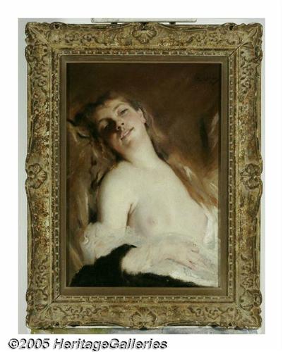 <B>CHARLES CHAPLIN (French 1825-1891)</B></I><BR>Ecstacy<BR>Oil on canvas<BR>21.5in. x 16.5in.<BR>Signed top right<BR><BR>Condition Report: Canvas has an old lining and a large waxed patch (3.5in. x 11in.) across top, significant fine inpainting (craquelure repair) in chin and body of figure, four small punctures in lower center repaired and overpainted, overpaint in top right corner near signature, signature appears to have been strengthened<BR>