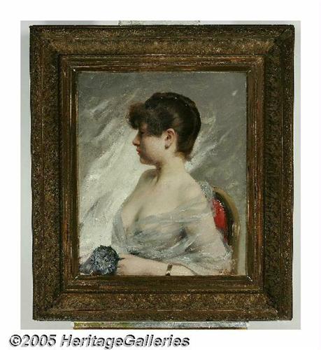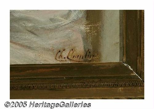 <B>CHARLES CHAPLIN (French 1825-1891)</B></I><BR>Portrait of a Young Woman<BR>Oil on canvas<BR>25.5in. x 21.5in.<BR>Signed lower right<BR><BR>Condition Report: Canvas has an old lining, overpainting across top edge, small puncture in cheek repaired and overpainted, small areas of inpainting in lip, behind head and near bouquet lower right<BR>