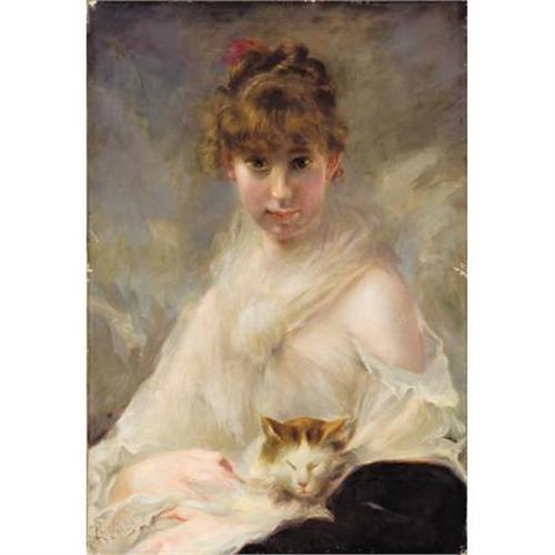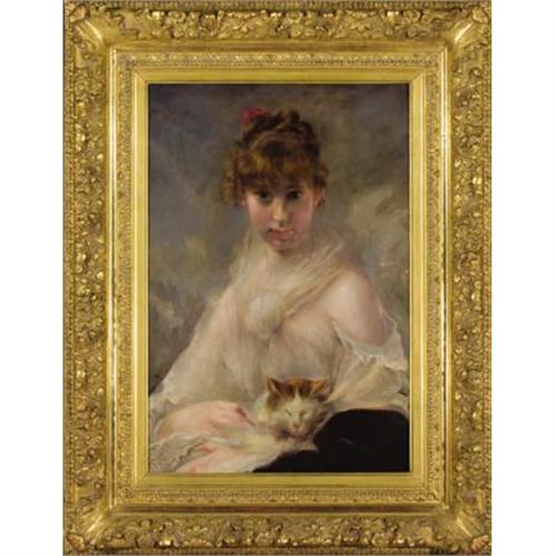 <B>CHARLES CHAPLIN (French, 1825-1891)</B></I><BR><I>Portrait of Young Woman with Kitten</B></I><BR>Oil on canvas<BR>29 x 19-3/4 inches (73.7 x 50.2 cm)<BR>Signed lower left: <I>Ch.Chaplin</B></I><BR> <BR>PROVENANCE:<BR>Alan Barnes Fine Art, Dallas (label verso).<B>Condition Report:</B> Original canvas, three patches on the verso in the lower left quadrant each approximately 1 3/4 inches by 1 inch square, strengthening underneath both eyes and nose, lips and hand, otherwise good condition.<BR><BR><b>Shipping:</b> Requires 3rd Party Shipping (<a target="_blank" href="http://www.heritageauctions.com/common/shipping.php">view shipping information</a>)