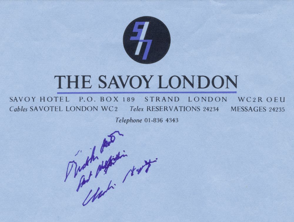 (1889-1977) American silent comedy film star who started his career with Mack Sennett and achieved worldwide fame with portrayal of "the tramp". Shaky old age signature and sentiment on a lettersheet from The Savoy London hotel. Fine.