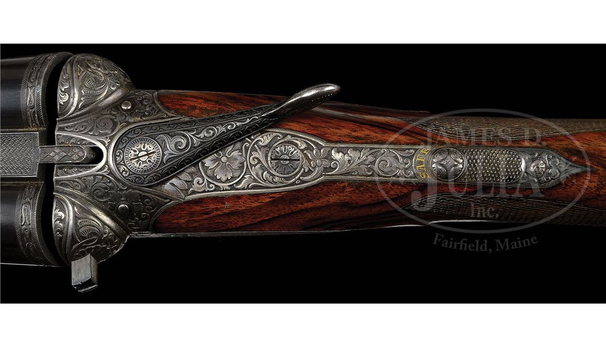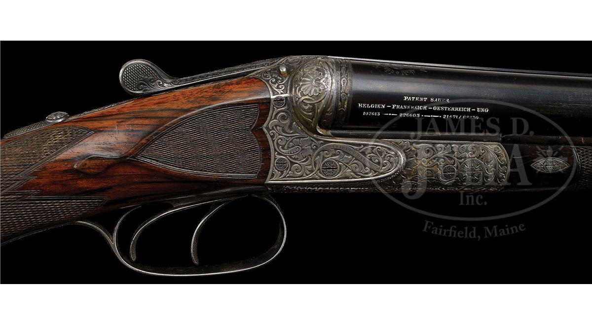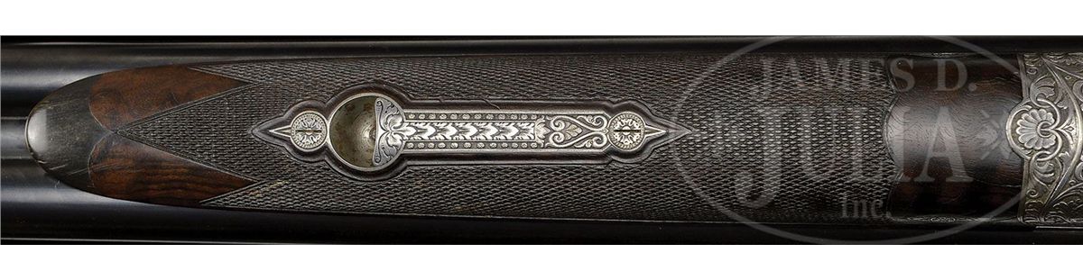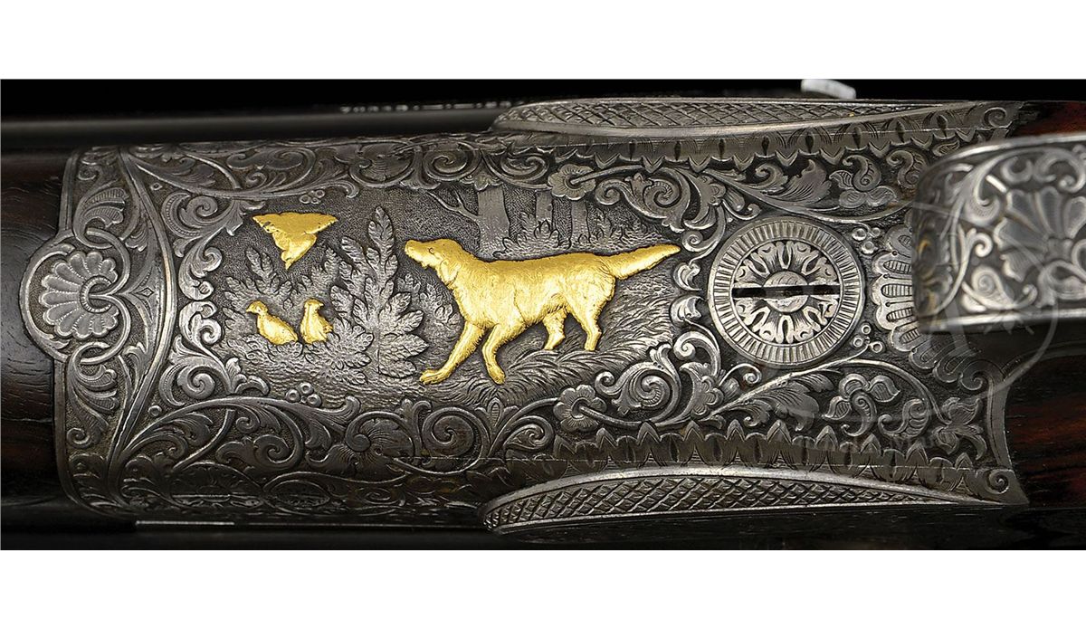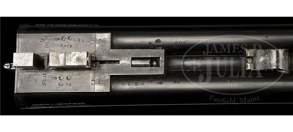 SN 681. Cal. 12 ga. 2-1/2" Chambers. 30" Steel dovetailed bbls are gold inlaid "Diamond Quality" on unmatted portion of concave, matted, game rib. There are bands of full relief, geometric engraving at breech ends surmounted by Krupp Special Steel three ring logos. Early J. P. Sauer patent information for Germany, England, America, Belgium, France, and Austria, along with numbers, is stamped on sides of bbls. Bbl flats are stamped with German imperial black powder proofs and crossed pistols surmounted by "H A L"(H. A. Lindner). Bottoms of bbls are stamped with imperial provisional proofs, Sauer's SS and caveman logos, as well as the no. "900". Case hardened action is stamped "Prussia" on water table, and features automatic safety (SAFE inlaid in gold), pin cocking indicators, square crossbolt third fastener, intercepting sears, and double triggers. Action is beautifully engraved with deep carved, semi-relief, open, attenuated, scrolled acanthus with fine stippled background. "CHARLES DALY" is on broad portion of one of the scrolls on each side of action. Scroll on bottom of action outlines semi-relief gold inlaid setter, preparing to retrieve falling grouse, with another two grouse still perched in pine tree. One standing, and one flying snipe are gold inlaid on matching trigger guard bow. SN is at grip. Beautifully marbled and lightly figured European walnut round knob, semi-pistol grip buttstock measures 13-7/8" over orig ribbed horn buttplate. Side panels with lozenge shaped drop points are checkered. Point pattern checkering at grip has double line borders, and round pistol grip knob has oval inlaid horn finial with raised teat. A gold oval on toe line is engraved "W E E" (William E. English, born to wealth and high social position, son of William H. English, congressman, bank president, and investor). Matching splinter ejector forend has inset scalloped and schnabeled horn tip, as well as Deeley release. Bore diameter: left-.730, right -.727. Bore restrictions: left -.038 (Full), right -.012 (IC). Wall thickness: left -.028, right -.029. Drop at heel: 2-5/8", drop at comb: 1-9/16". Weight: 7 lbs. 4 oz. LOP: 13-7/8". Also included is a tattered leg o' mutton case. PROVENANCE: Copies of Winter 2008 "Journal of German Gun Collectors Association" with article on Daly guns, picturing this particular gun. As well as history of the English family. CONDITION: Fine. Bbls retain most of an old re-black over light frosting and marks, which has subsequently silvered and thinned. Engraving remains sharp and clear. Action retains a considerable amount of its orig case hardening color, percentage difficult to ascertain because of depth of engraving; otherwise showing considerable silvering on high points and light wear to gold inlay. Overall effect is very pleasing. Stocks retain most of what appears to be orig French polish finish, with a number of fairly deep gouges and scratches, and numerous other minor marks. Checkering is lightly worn, and appears to have been cleaned, not re-cut. Forend shows considerable wear through finish and on checkering. There is a 3/4" crack running from bottom right near iron toward checkering. Bores are excellent. Action is tight. Bbls are on face. Ejectors are in time. Case is repaired with tape, with some straps missing and others broken. Handle is good. An unusual early Daly. 4-49381 MGM270
