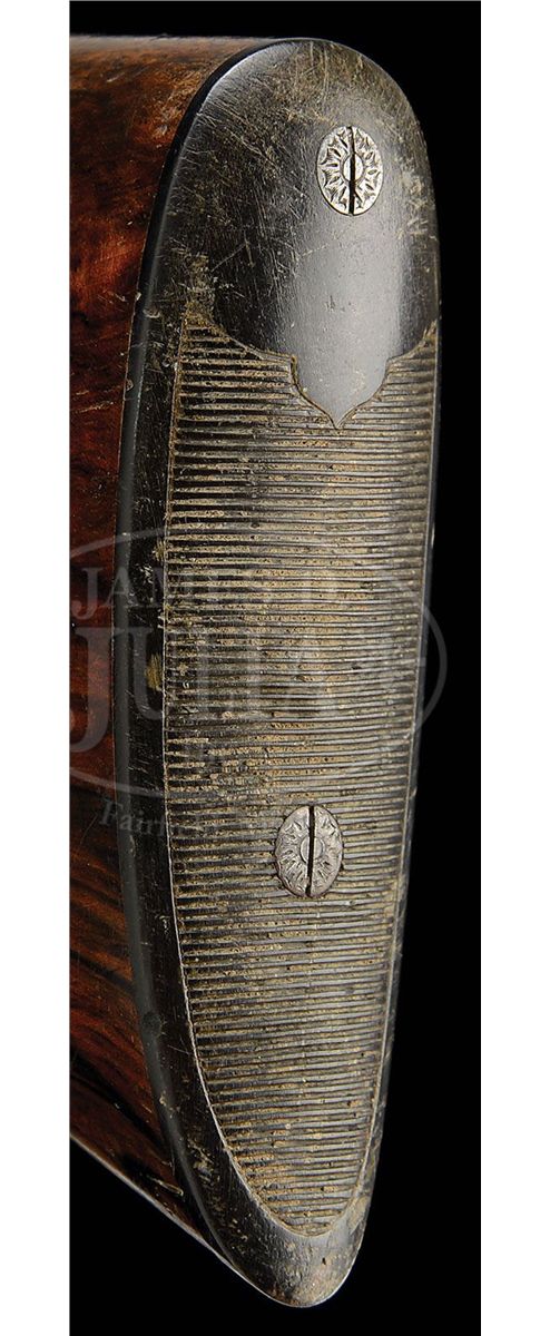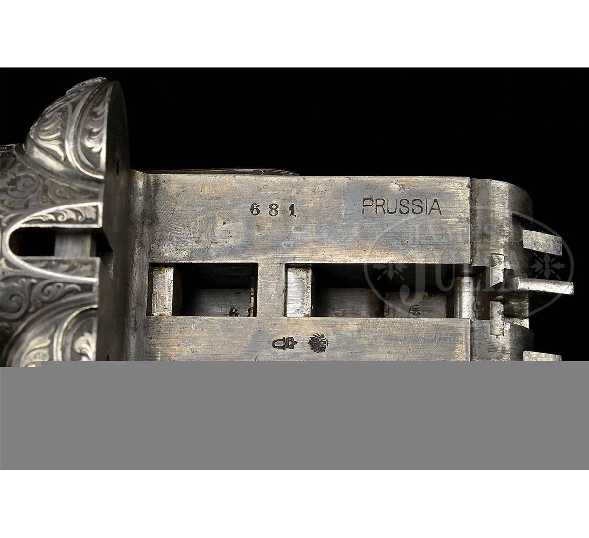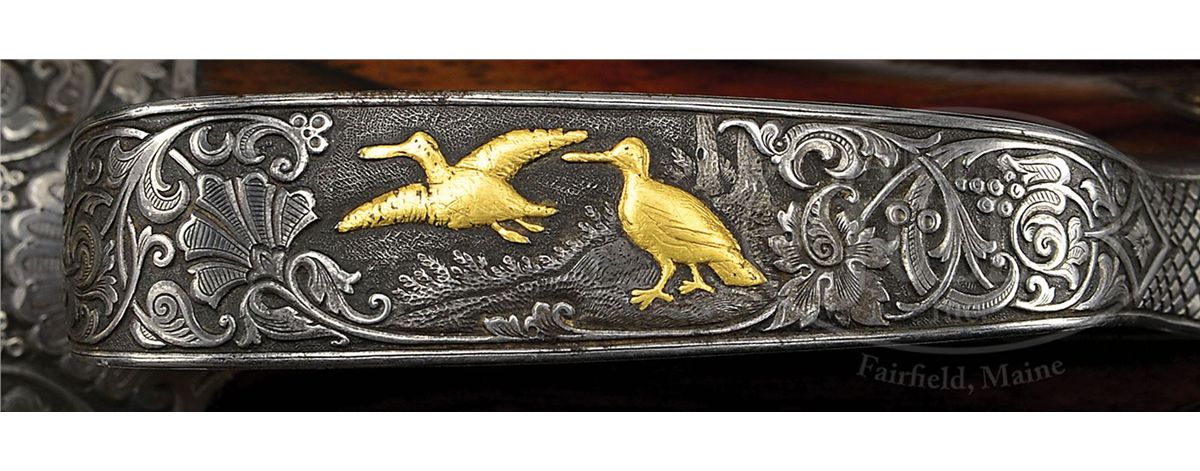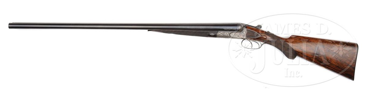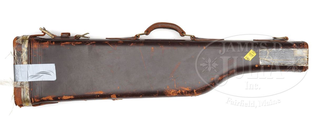 SN 681. Cal. 12 ga. 2-1/2" Chambers. 30" Steel dovetailed bbls are gold inlaid "Diamond Quality" on unmatted portion of concave, matted, game rib. There are bands of full relief, geometric engraving at breech ends surmounted by Krupp Special Steel three ring logos. Early J. P. Sauer patent information for Germany, England, America, Belgium, France, and Austria, along with numbers, is stamped on sides of bbls. Bbl flats are stamped with German imperial black powder proofs and crossed pistols surmounted by "H A L"(H. A. Lindner). Bottoms of bbls are stamped with imperial provisional proofs, Sauer's SS and caveman logos, as well as the no. "900". Case hardened action is stamped "Prussia" on water table, and features automatic safety (SAFE inlaid in gold), pin cocking indicators, square crossbolt third fastener, intercepting sears, and double triggers. Action is beautifully engraved with deep carved, semi-relief, open, attenuated, scrolled acanthus with fine stippled background. "CHARLES DALY" is on broad portion of one of the scrolls on each side of action. Scroll on bottom of action outlines semi-relief gold inlaid setter, preparing to retrieve falling grouse, with another two grouse still perched in pine tree. One standing, and one flying snipe are gold inlaid on matching trigger guard bow. SN is at grip. Beautifully marbled and lightly figured European walnut round knob, semi-pistol grip buttstock measures 13-7/8" over orig ribbed horn buttplate. Side panels with lozenge shaped drop points are checkered. Point pattern checkering at grip has double line borders, and round pistol grip knob has oval inlaid horn finial with raised teat. A gold oval on toe line is engraved "W E E" (William E. English, born to wealth and high social position, son of William H. English, congressman, bank president, and investor). Matching splinter ejector forend has inset scalloped and schnabeled horn tip, as well as Deeley release. Bore diameter: left-.730, right -.727. Bore restrictions: left -.038 (Full), right -.012 (IC). Wall thickness: left -.028, right -.029. Drop at heel: 2-5/8", drop at comb: 1-9/16". Weight: 7 lbs. 4 oz. LOP: 13-7/8". Also included is a tattered leg o' mutton case. PROVENANCE: Copies of Winter 2008 "Journal of German Gun Collectors Association" with article on Daly guns, picturing this particular gun. As well as history of the English family. CONDITION: Fine. Bbls retain most of an old re-black over light frosting and marks, which has subsequently silvered and thinned. Engraving remains sharp and clear. Action retains a considerable amount of its orig case hardening color, percentage difficult to ascertain because of depth of engraving; otherwise showing considerable silvering on high points and light wear to gold inlay. Overall effect is very pleasing. Stocks retain most of what appears to be orig French polish finish, with a number of fairly deep gouges and scratches, and numerous other minor marks. Checkering is lightly worn, and appears to have been cleaned, not re-cut. Forend shows considerable wear through finish and on checkering. There is a 3/4" crack running from bottom right near iron toward checkering. Bores are excellent. Action is tight. Bbls are on face. Ejectors are in time. Case is repaired with tape, with some straps missing and others broken. Handle is good. An unusual early Daly. 4-49381 MGM270