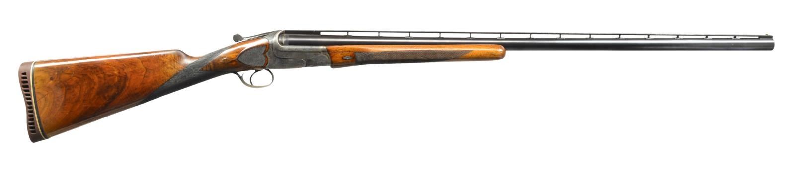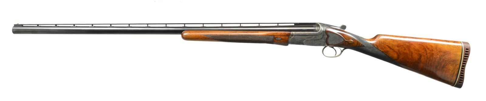 Cal. 12 Ga. S# 10555. Mfg. in Prussia by Lindner. Bbl. 32" VR of Krupp fluid steel w/ ivory front & mid beads. Scalloped boxlock top lever action w/ case colored finish & fine arabesque scroll hand engraving. Beavertail forearm & straight hand stock of fancy European walnut w/ tear drop points & hand checkering that extends to stock ears. LOP: 14 1/8" over aftermarket Pachmayr trap pad. Toeline of stock has German silver oval nameplate. DAC: 1 7/16". DAH: 2 3/8". Stock is cast off for right handed shooter. Minimum wall thickness: .062". Bore diameter: .724". Choke constriction: .033. Weight: 7 lbs., 14 oz. CONDITION: over 90% bbl. blue. Action retains 70% light & fading case colors showing scattered sm. spots of corrosion. Wood shows light wear w/ scattered scratches & handling marks. Forearm has 2 1/2" x 1 1/2" added wood repair forward of action. Stock shows sm. hairline cracks extending from receiver. Ejector is out of time. Clean bright bore. (20-2493/DS). CURIO. $1,000-1,500.