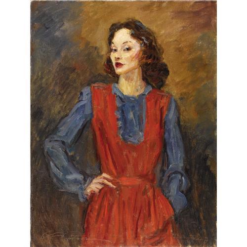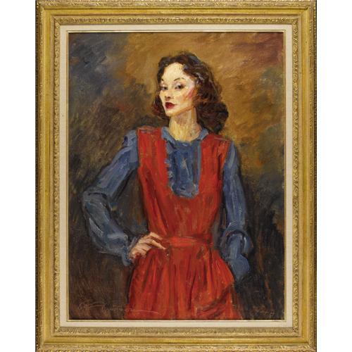 <B>CHARLES DANA GIBSON</B></I> (American 1867- 1944)<BR><I>Girl in Red and Blue,</B></I> 1942<BR>Oil on canvas<BR>37 x 28 inches (94 x 71.1 cm)<BR>Signed lower left: <I>C.D Gibson</B></I><BR>Dated lower right:<I> 1942</B></I><BR><BR> <B>Condition Report:</B> strong colors, small area of strengthening to woman's upper cheekbone<BR><BR><b>Shipping:</b> Requires 3rd Party Shipping (<a target="_blank" href="http://www.heritageauctions.com/common/shipping.php">view shipping information</a>)