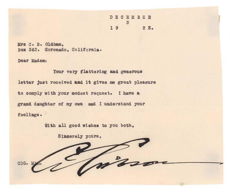 CHARLES DANA GIBSON (1867 - 1944). American illustrator. Gibson is best known for his famous “Gibson Girl.” TLS. 1 page. 6 1/2” x 5 1/2”.December 3, 1923 Mounting trace on verso. Fine.