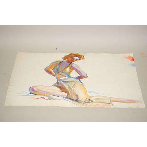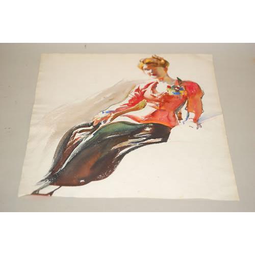 CHARLES DE FEO 2 SIDED WATERCOLOR ON PAPER-DOUBLE SIDED PAINTING OF YOUNG 1940'S STYLE WOMEN: (1) IN A RED FITTED JACKET, LONG GREEN SKIRT & CORSAGE & (1) IN A 2 PC. UNDERGARMENT ENSEMBLE-UNSIGNED (ATTRIBUTED), UNFRAMED (20.5" X 15.5") - WEAR, SOILING