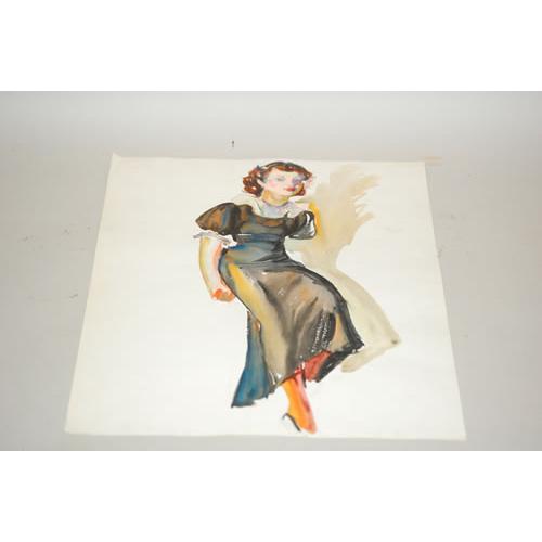 CHARLES DE FEO WATERCOLOR ON PAPER PORTRAIT OF A YOUNG 1930'S BRUNETTE WOMAN LEANING & WEARING A SWEETHEART FROCK W/ PUFFY SLEEVES & LACY COLLAR & CUFFS-UNSIGNED (ATTRIBUTED), UNFRAMED (20" X 14") - WEAR, SOILING