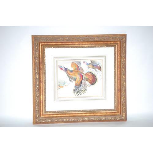 CHARLES DE FEO WATERCOLOR PAINTING OF 2 FLYING TURKEYS FLUSHED FROM COVER BY A RED FOX-SIGNED CHARLES DE FEO ON LOWER RIGHT IN A CUSTOM DECORATED MAT & GILT CARVED FRAME (9 1/2" X 11 1/4") - LIGHT WEAR