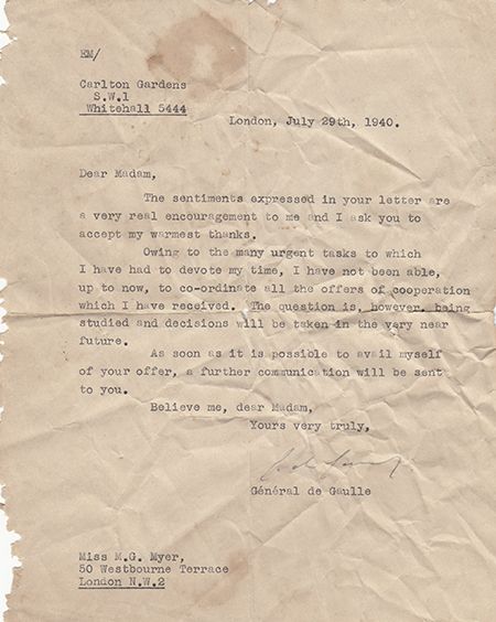 (1890-1970) French general who led the Free French Forces in World War II, and went on to found and lead the Fifth French Republic. War-date T.L.S. "C. de Gaulle", 1p. 8vo., London, July 19, 1940, to Miss M.G. Myer of London. In part: "...The sentiments expressed in your letter are a very real encouragement to me and I ask you to accept my warmest thanks. Owing to the many urgent tasks to which I have had to devote my time, I have not been able, up to now, to co-ordinate all the offers of cooperation which I have received. The question is, however, being studied and decisions will be taken in the very near future. As soon as it is possible to avail myself of your offer, a further communication will be sent to you...". Quite wrinkled, water spots at top and bottom and a ragged left edge, still quite good and a rare war-date example.