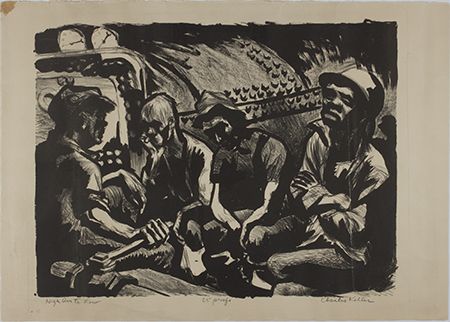 (1914-2006) American painter and printmaker, Social Realist & W.P.A. artist, sympathetic to labor and racial equality, well represented in museums such as the British Museum of Art, The Smithsonian, library of Congress, Schomberg Center and more. Rare signed lithograph, an early labor portrayal (undated), entitled "High Air to Low", with Keller's social conscience on full display, combining strong dark brush strokes, charcoal and drypoint to grimly depict the plight of four exhusted mineshaft workers of mixed race. Clearly signed, titled and editioned "25 proofs" in pencil in the margin under the image. Top edge ragged, one vertical crease to right, neglible folds. otherwise suitable for framing.