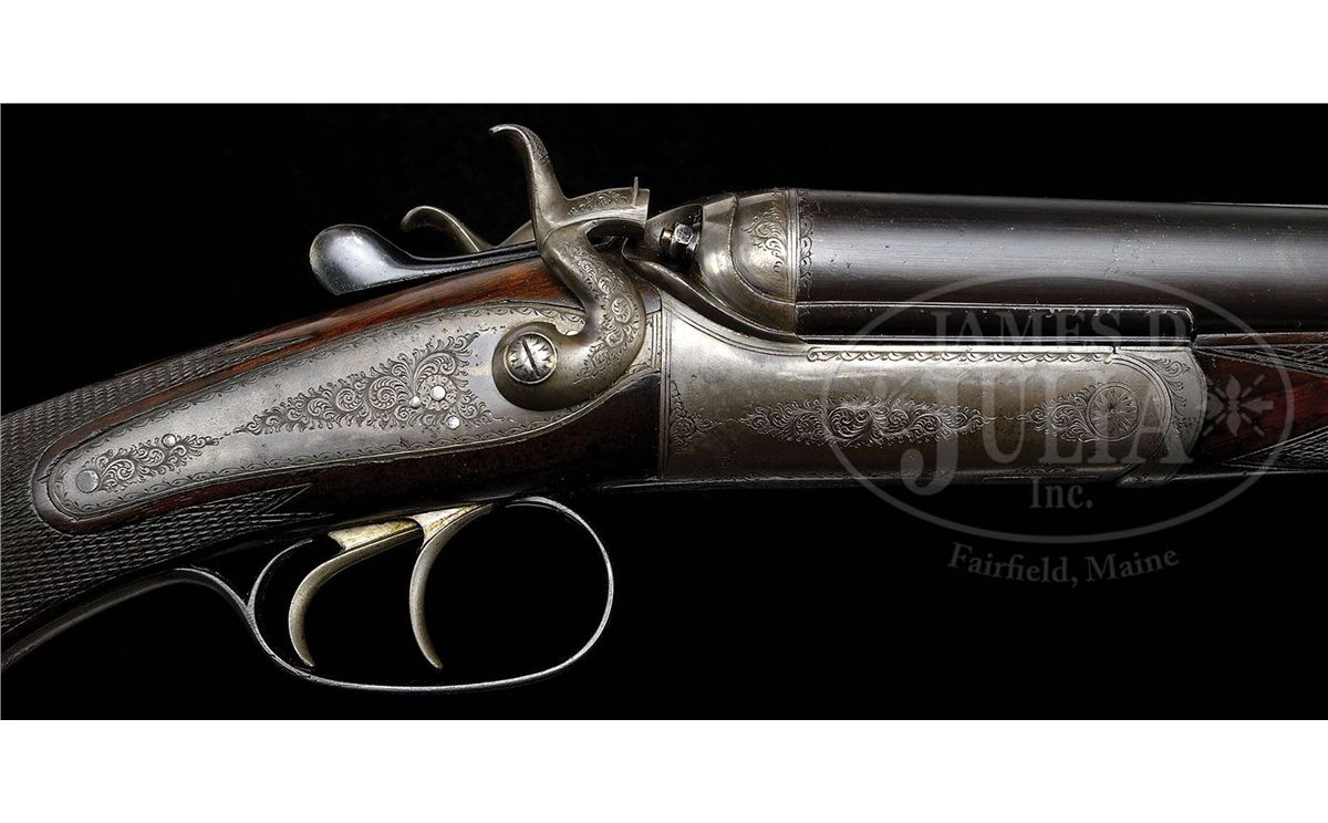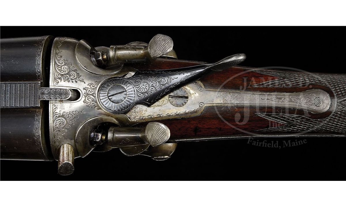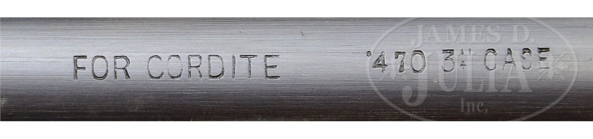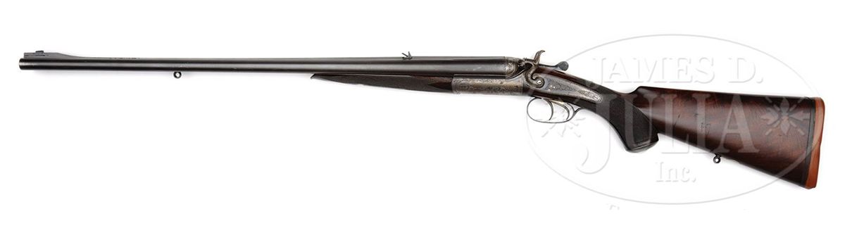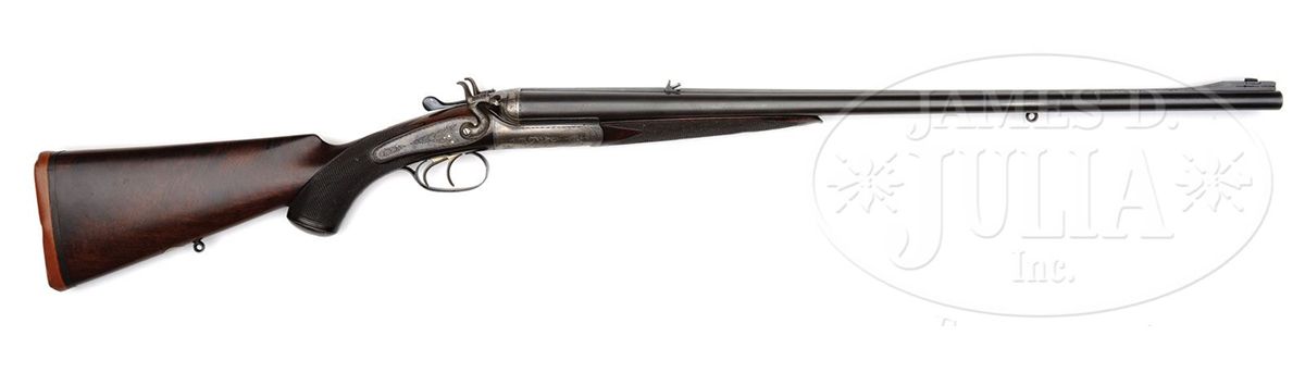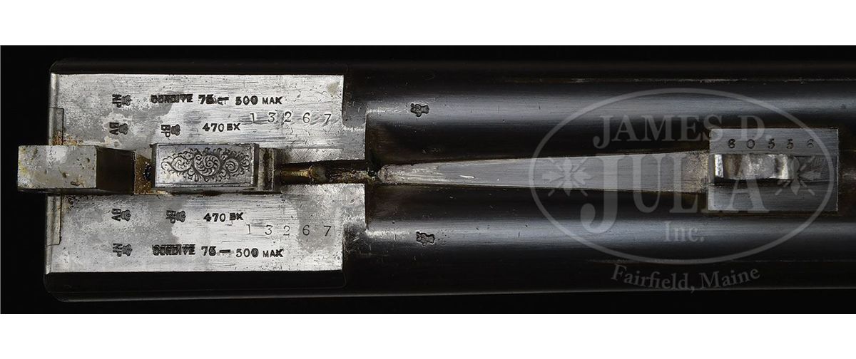 SN 13267. (ca 1911) Cal. .470 NE. 26" Chopper lump bbls with matted, full length rib, swamped toward muzzles to form ramp for silver bead front sight, are mounted with one standing, two folding leaf express rear sight, marked for 100, 200, and 300 yards. "Charles Lancaster" is engraved on tops of bbls, and "FOR CORDITE .470 3-1/4" CASE". Bbl flats are stamped with Birmingham nitro proofs for 75 grains of cordite, and 500 grain bullet. "60556" is stamped on loop. A large sling eye is affixed to bottom rib. Round bodied, top lever, case hardened action features Greener crossbolt third fastener, and is mounted with back-action rebounding locks, fitted with round bodied serpentine hammers. (Action can be opened when right lock is cocked.) Action is engraved with about 50% coverage medium scroll, and foliate borders. No makers name is present. Scroll engraved trigger guard has SN on tang, which extends to engraved steel domed grip cap. Dense, well figured European walnut capped pistol grip buttstock measures 14-1/4" over an old Silver pad. Flat top point pattern checkering is at grip, with a sling eye and vacant silver oval on toe line. Matching splinter forend has nicely shaped steel tip and Deeley release. Drop at heel: approx 2-1/4", drop at comb: approx 1-3/4". Weight: 10 lbs. 10 oz. LOP: 14-1/4". CONDITION: Fine, as partially refinished. Bbls retain 80 - 90% of an old re-blue, over a number of pits, that did not file out. There is a long scratch at rear of left bbl. Action and lockplates retain a considerable amount of their orig case hardening color, considerably flaked to pewter gray/ brown. Stocks retain nearly all of an old refinish, with some fairly heavy marks on left butt, and some lighter ones on right. Checkering is slightly worn, and has been re-cut. A 1/4" x 2" piece of wood is missing from left rear of forend. Bores are very fine, very lightly frosted, strong rifling throughout. Action is tight. Bbls are on face. Locks are crisp. This should make a great working rifle. Many hunters appreciate hammer rifles for the absolute silence with which they can be operated. 4-49216 MGM227
