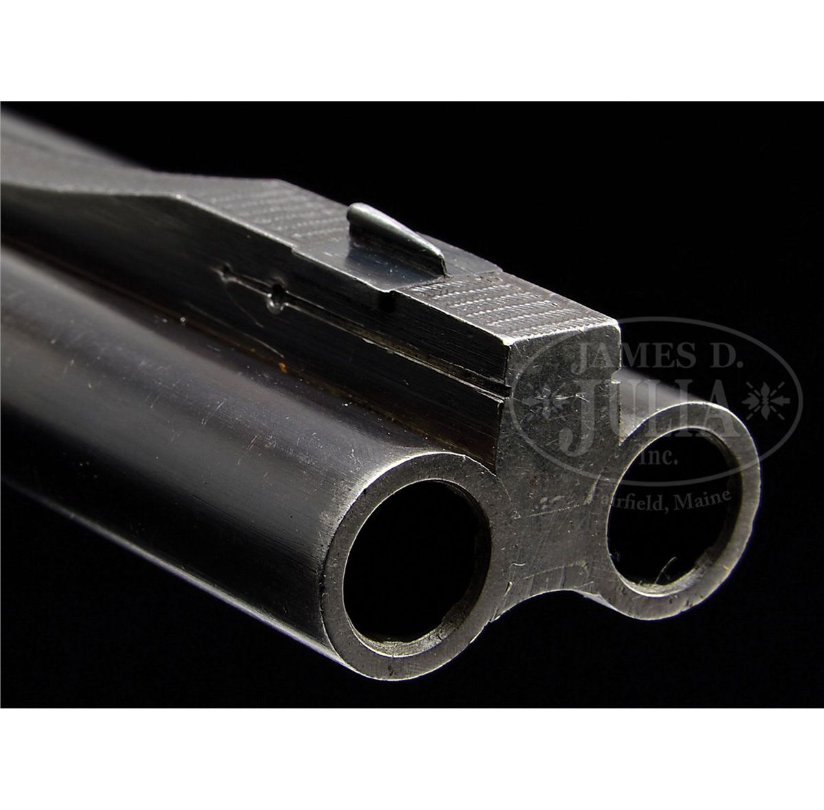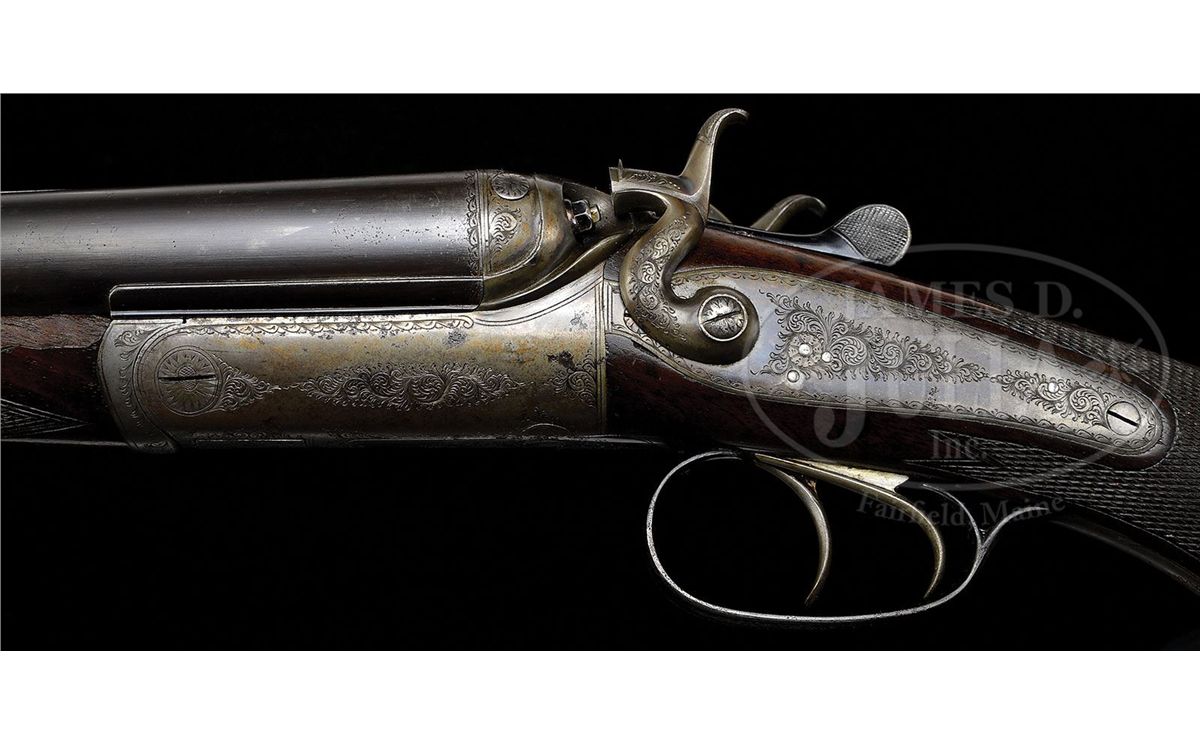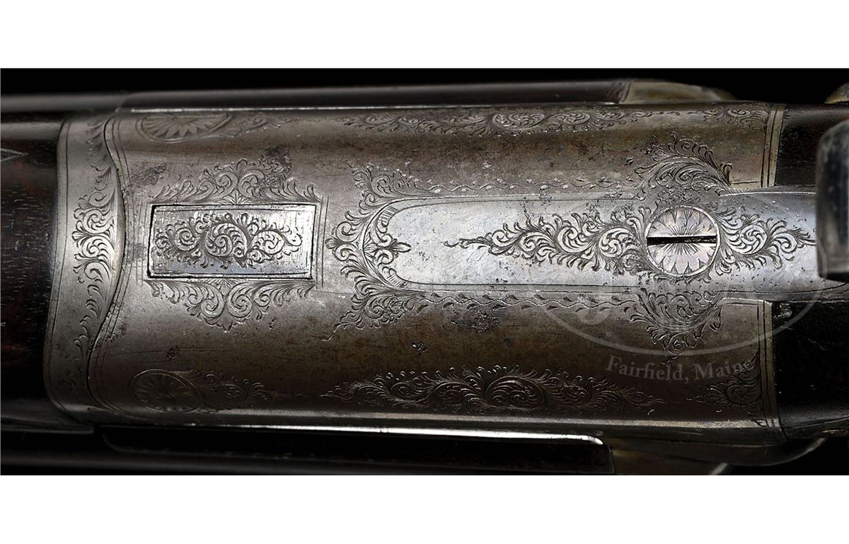 SN 13267. (ca 1911) Cal. .470 NE. 26" Chopper lump bbls with matted, full length rib, swamped toward muzzles to form ramp for silver bead front sight, are mounted with one standing, two folding leaf express rear sight, marked for 100, 200, and 300 yards. "Charles Lancaster" is engraved on tops of bbls, and "FOR CORDITE .470 3-1/4" CASE". Bbl flats are stamped with Birmingham nitro proofs for 75 grains of cordite, and 500 grain bullet. "60556" is stamped on loop. A large sling eye is affixed to bottom rib. Round bodied, top lever, case hardened action features Greener crossbolt third fastener, and is mounted with back-action rebounding locks, fitted with round bodied serpentine hammers. (Action can be opened when right lock is cocked.) Action is engraved with about 50% coverage medium scroll, and foliate borders. No makers name is present. Scroll engraved trigger guard has SN on tang, which extends to engraved steel domed grip cap. Dense, well figured European walnut capped pistol grip buttstock measures 14-1/4" over an old Silver pad. Flat top point pattern checkering is at grip, with a sling eye and vacant silver oval on toe line. Matching splinter forend has nicely shaped steel tip and Deeley release. Drop at heel: approx 2-1/4", drop at comb: approx 1-3/4". Weight: 10 lbs. 10 oz. LOP: 14-1/4". CONDITION: Fine, as partially refinished. Bbls retain 80 - 90% of an old re-blue, over a number of pits, that did not file out. There is a long scratch at rear of left bbl. Action and lockplates retain a considerable amount of their orig case hardening color, considerably flaked to pewter gray/ brown. Stocks retain nearly all of an old refinish, with some fairly heavy marks on left butt, and some lighter ones on right. Checkering is slightly worn, and has been re-cut. A 1/4" x 2" piece of wood is missing from left rear of forend. Bores are very fine, very lightly frosted, strong rifling throughout. Action is tight. Bbls are on face. Locks are crisp. This should make a great working rifle. Many hunters appreciate hammer rifles for the absolute silence with which they can be operated. 4-49216 MGM227