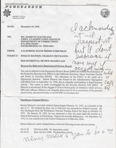 (b.1934) Drifter whose "family" committed the infamous Tate-LaBianca murders in 1969. So far has eluded the gas chamber. Annotated copy of a 1998 California Dept. of Corrections letter concerning a transfer of Manson to a Protective Housing Unit at Corcoran. The 7pp. letter lists all of Manson's arrests, movements through the corrections system, and disciplinary actions taken, all of which include many entries. Manson annotates the document in several places, noting: "...I acknowledge it - I respect it but I don't embrace it nor will I accept...never needed a you to be a me...30 years I've been out of the hole about 3 or 2 1/2 years...". He also indicates in what periods he had been placed in solitary. Last page's bottom section gone, no loss of text, else very good.