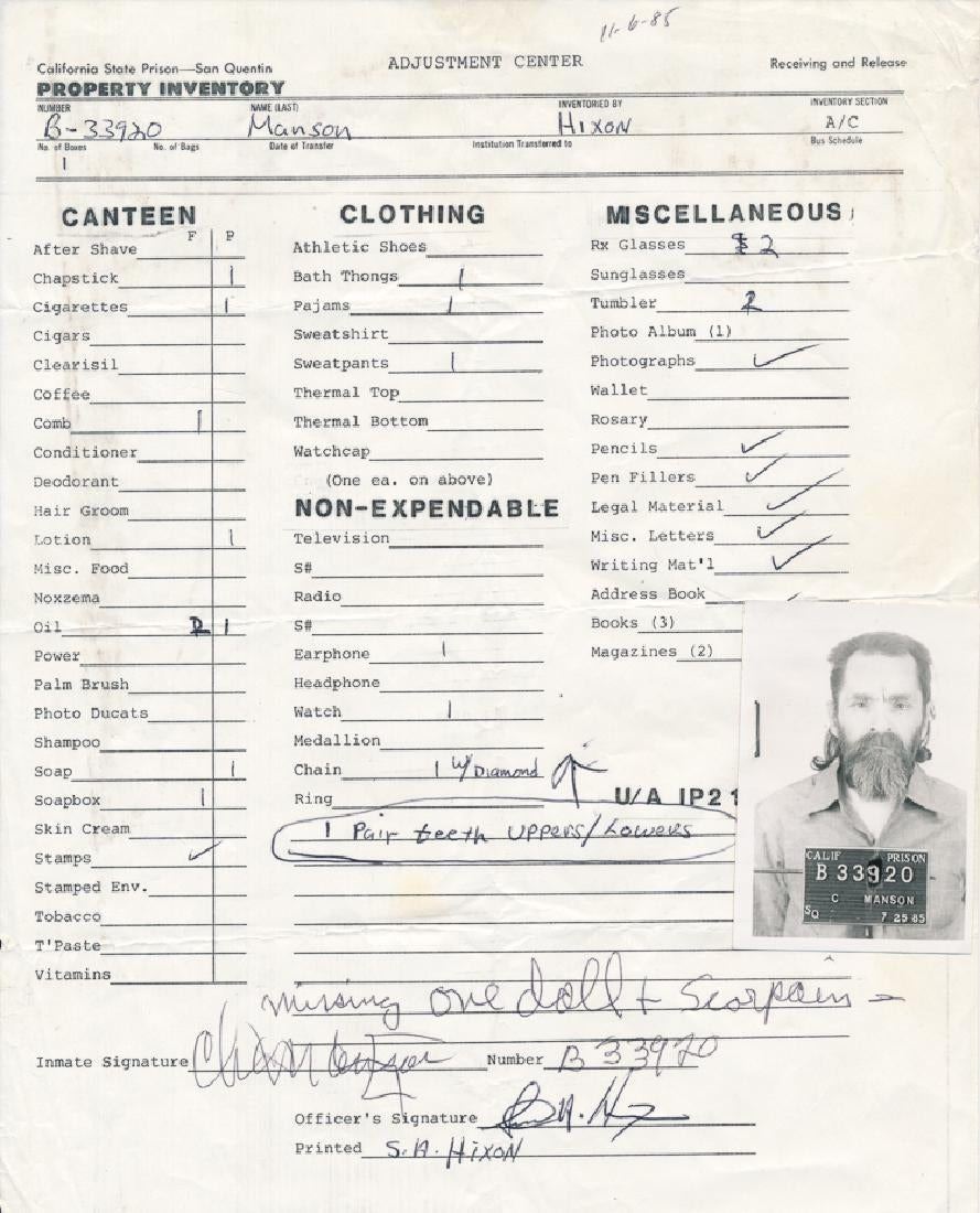 An inventory of the contents of Manson's cell in 1985, signed by him at bottom to which he adds his prisoner number and a note: "missing one doll + scorpion". A rare mug shot prison photo of Manson at the time is stapled top the document