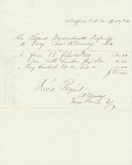 CHARLES MUDGE (d. 1863) Enlisted in the hard-fighting 2nd Mass. Infy. as a 1st Lieutenant on May 25, 1861. He rapidly rose through the ranks, finally promoted to Lt. Colonel on June 6, 1863, killed in action leading his men at Gettysburg on July 3, 1863. War-date D.S., Apr. 27, 1863, a receipt recording payment for fifes, two silk marker flags and drum hoops - all of which were no doubt well used at Gettysburg five weeks later. Fine.