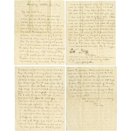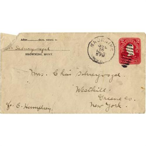 <B>CHARLES SCHREYVOGEL WESTERN ARTIST AUTOGRAPH LETTER 1905</B></I> - Schreyvogel, Charles (1861-1912) Following formal art training in Germany (1886), Schreyvogel returned to the United States, spending much of his time sketching the horses, cowboys and Indians in 'Buffalo Bill's Wild West” In 1893, Schreyvogel made his first trip west, visiting the Ute reservation in Colorado, but the resulting paintings did not sell and he returned to doing commissioned portraits and lithographic work. In 1901, his piece My Bunkie, of a cavalryman rescuing a fellow soldier from hostile Indians, won the first prize at the National Academy of design. His studio and collection are on permanent display at the National Cowboy Hall of Fame and Western Heritage center in Oklahoma City. <B>Autographed letter signed.</B></I> Two pages, two sided, Quarto, Browning, Montana, July 7, 1905. While on tour with Buffalo Bills Wild West, Schreyvogel writes this letter to his wife. In part: <I>“The weather here is...cold..It was warm from 9 to 4...then it begins to get very cold. The chances are very great and sudden. The Indians were going to put up the Medicine Lodge, and had just finished when they were stopped by agent and they had to break camp, so did not have all the dances they should have had. I photographed quite a few however. I am developing today and if the weather permits will start painting tomorrow. I have had all kinds of trouble with my camera, but have some things any way. I started out for the Indian camp every morning. The camp was the most artistic I have ever seen. The color of the different tepees was beautiful. I bought 4 squaw dresses…three war shirts with ermine skins…two very beautiful, black inlaid with lead, pipes here Schreyvogel sketches the two pipes .. And one knife sheath with one of the old time Hudson Bay daggers like this another sketch of knife and sheath…the Indians are after me they want to sell their things, they are getting to be very poor. A few years ago they would not sell shirt less than 75-100 dollars…I got my things very cheap...” </B></I> A magnificent letter with exceptional content accompanied by original transmittal envelope. <BR><BR><B>Condition:</B></I> Fine condition.<BR><BR><b>Shipping:</b> Flat Material, Small (<a target="_blank" href="http://www.heritageauctions.com/common/shipping.php">view shipping information</a>)