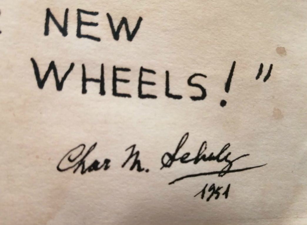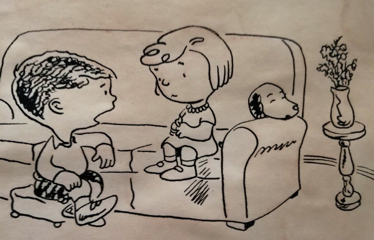 A Charles Schulz drawing dated 1951, showing Snoppy one of the world's most loved dogs resting at the end of the sofa, while a little girl and boy talk. Size: 12x9.5 inches. Condition is fair. Mounted and framed. Supplied with coa.